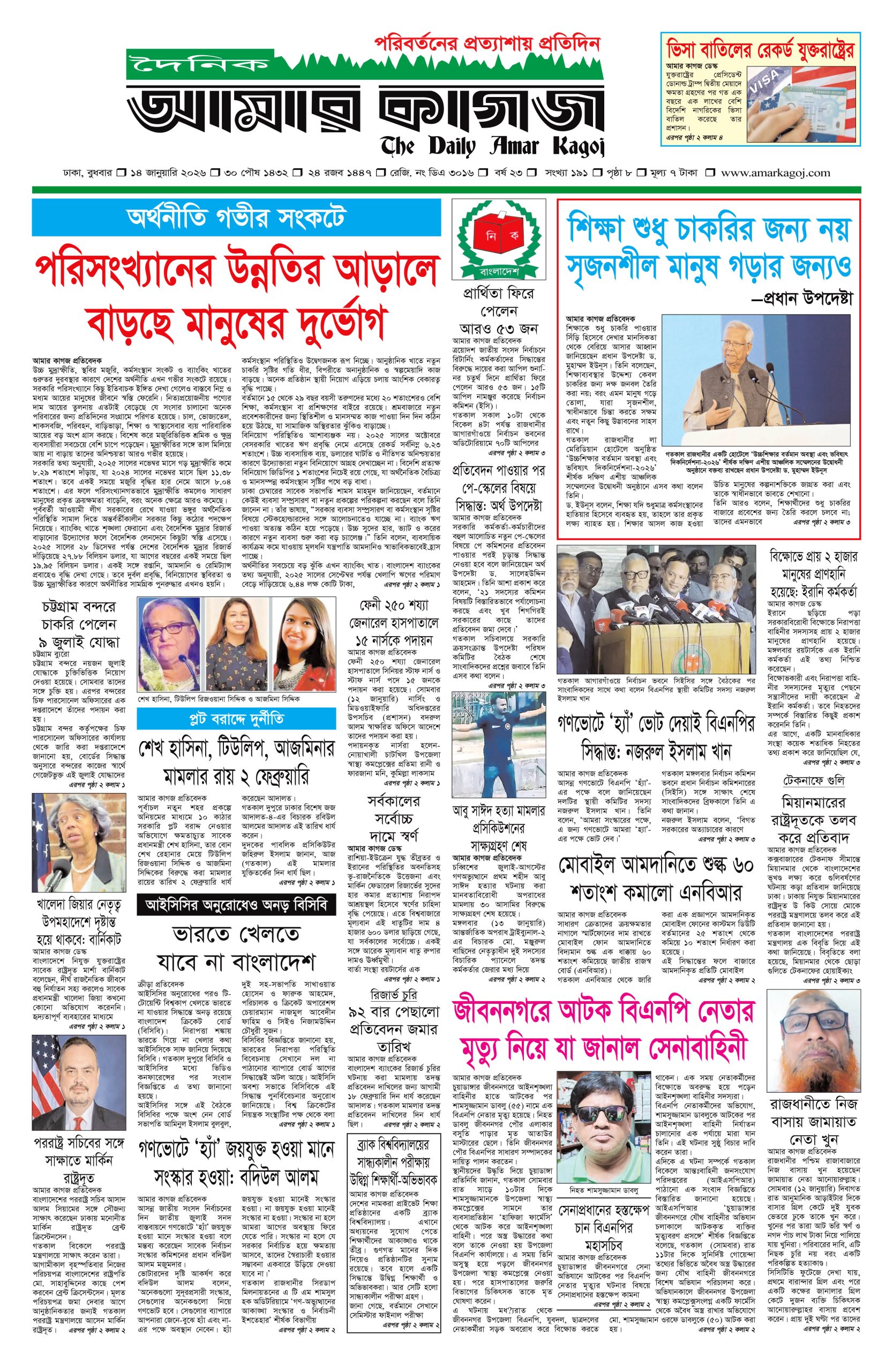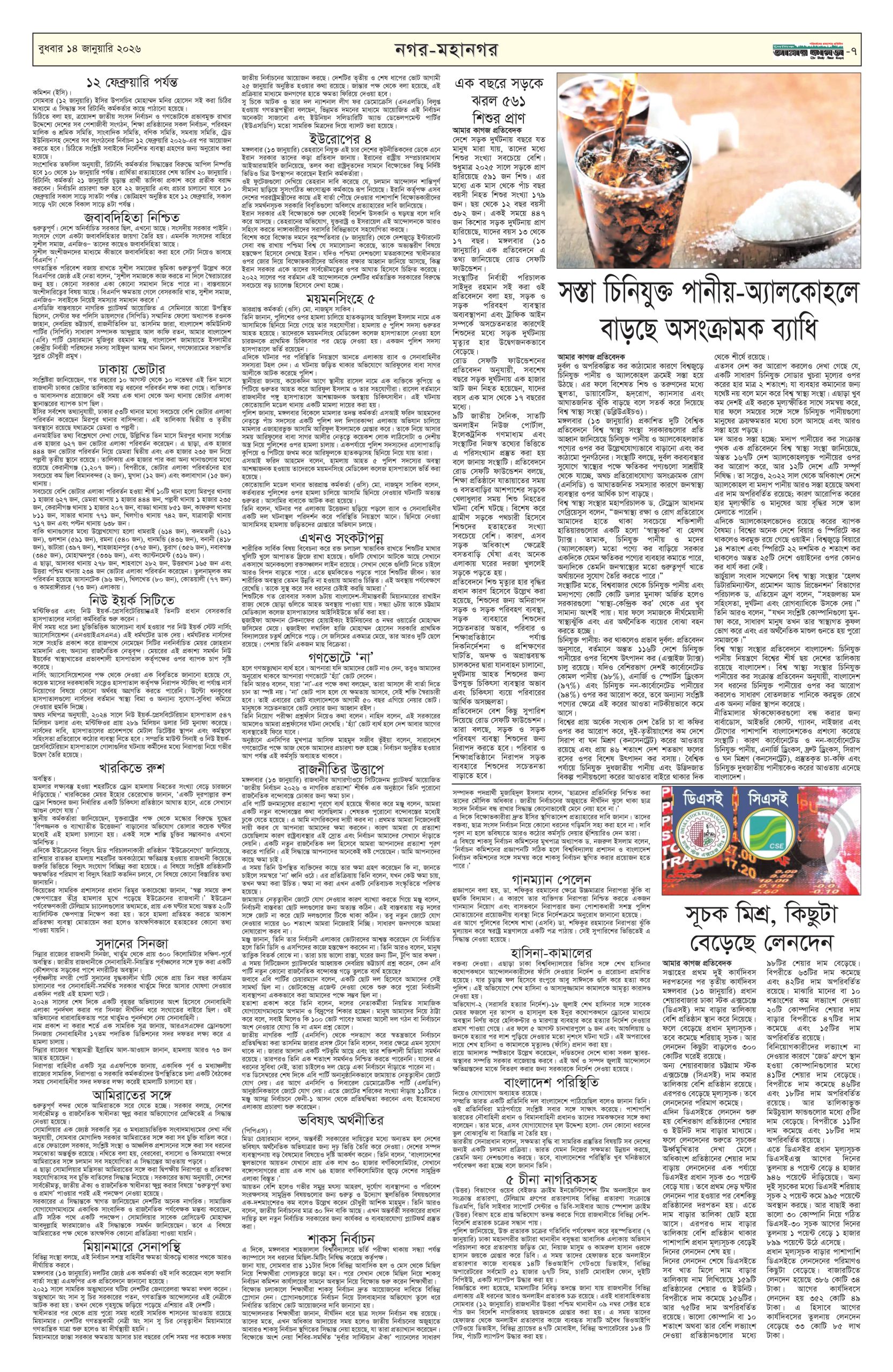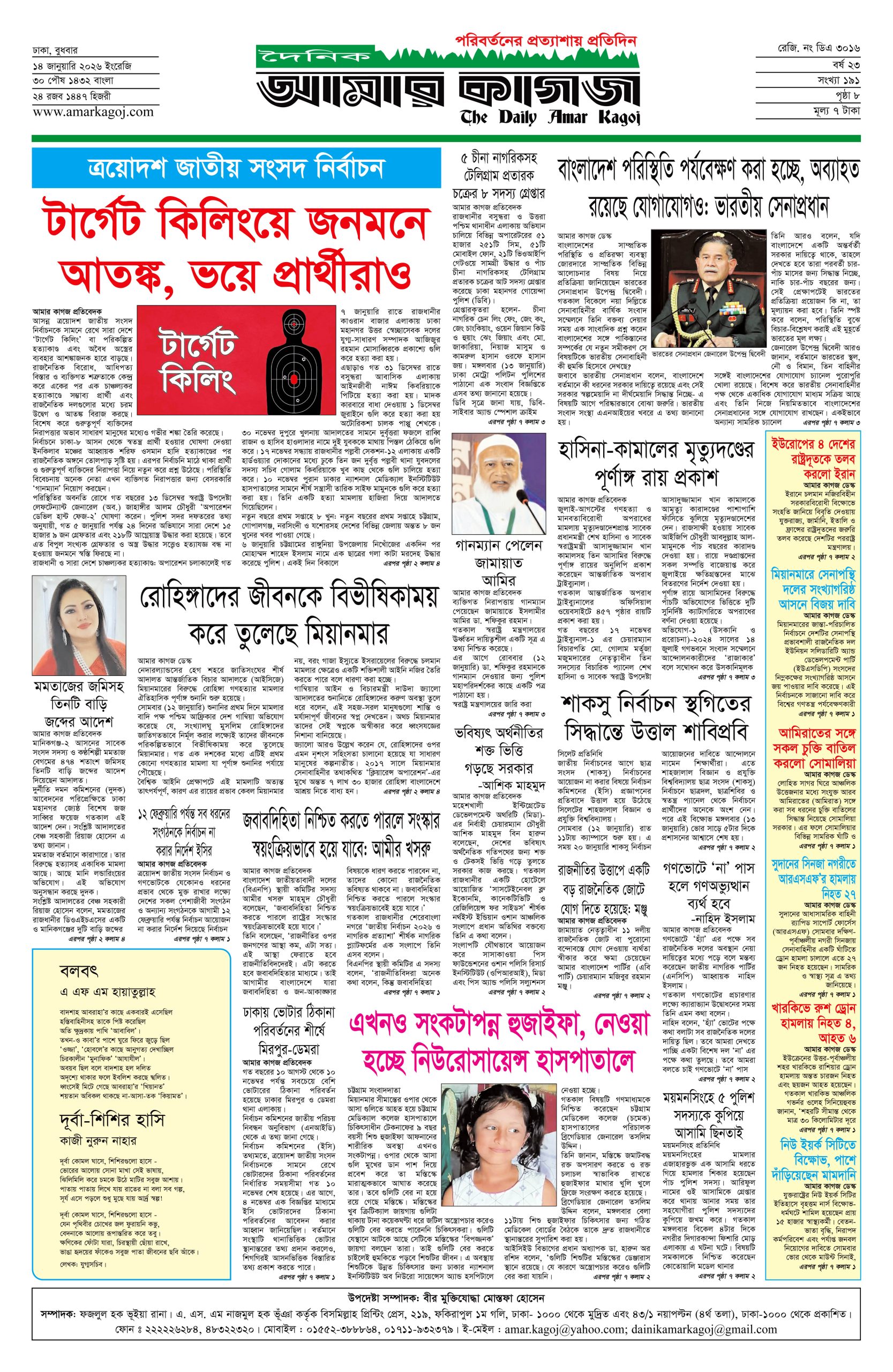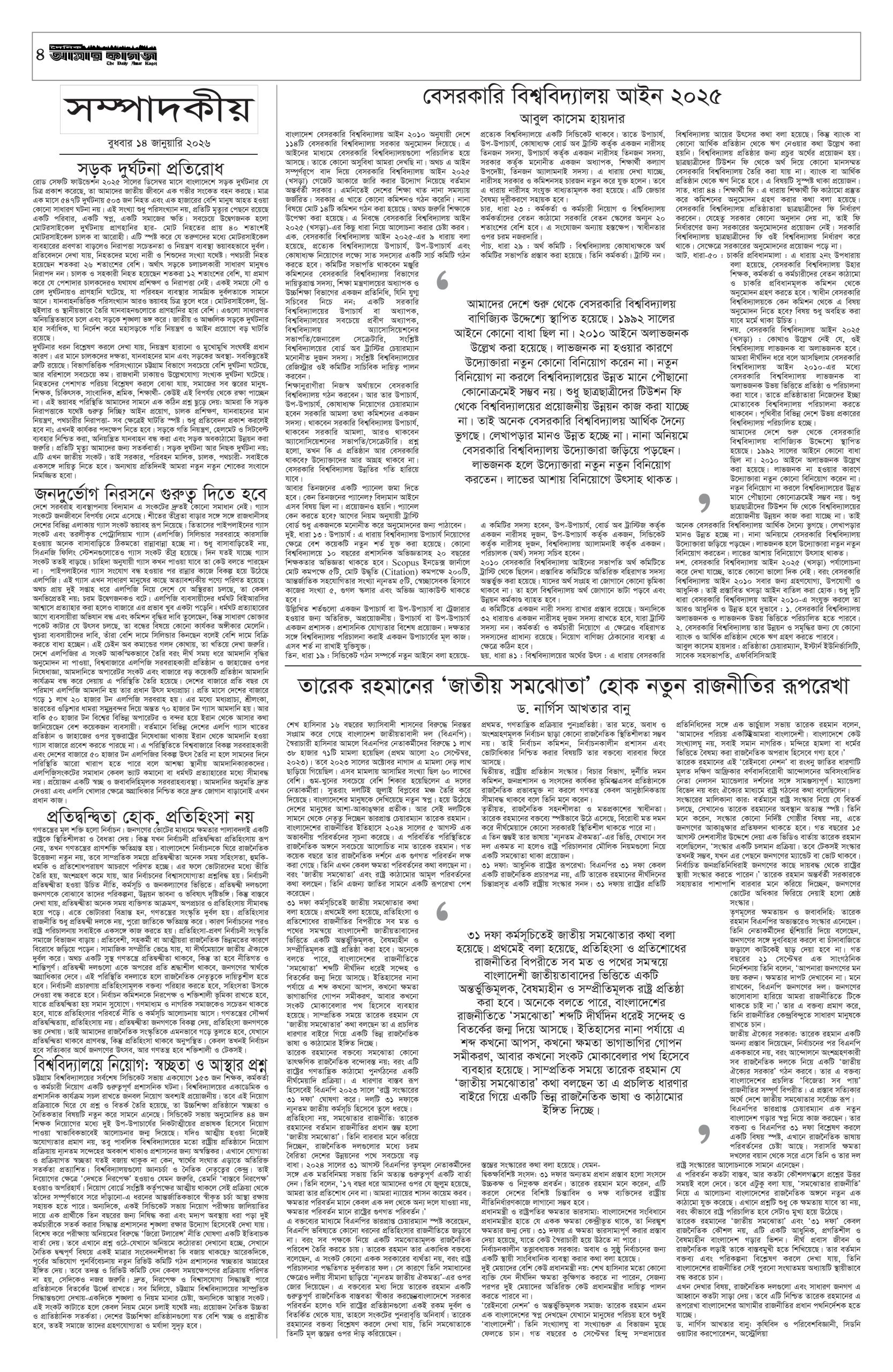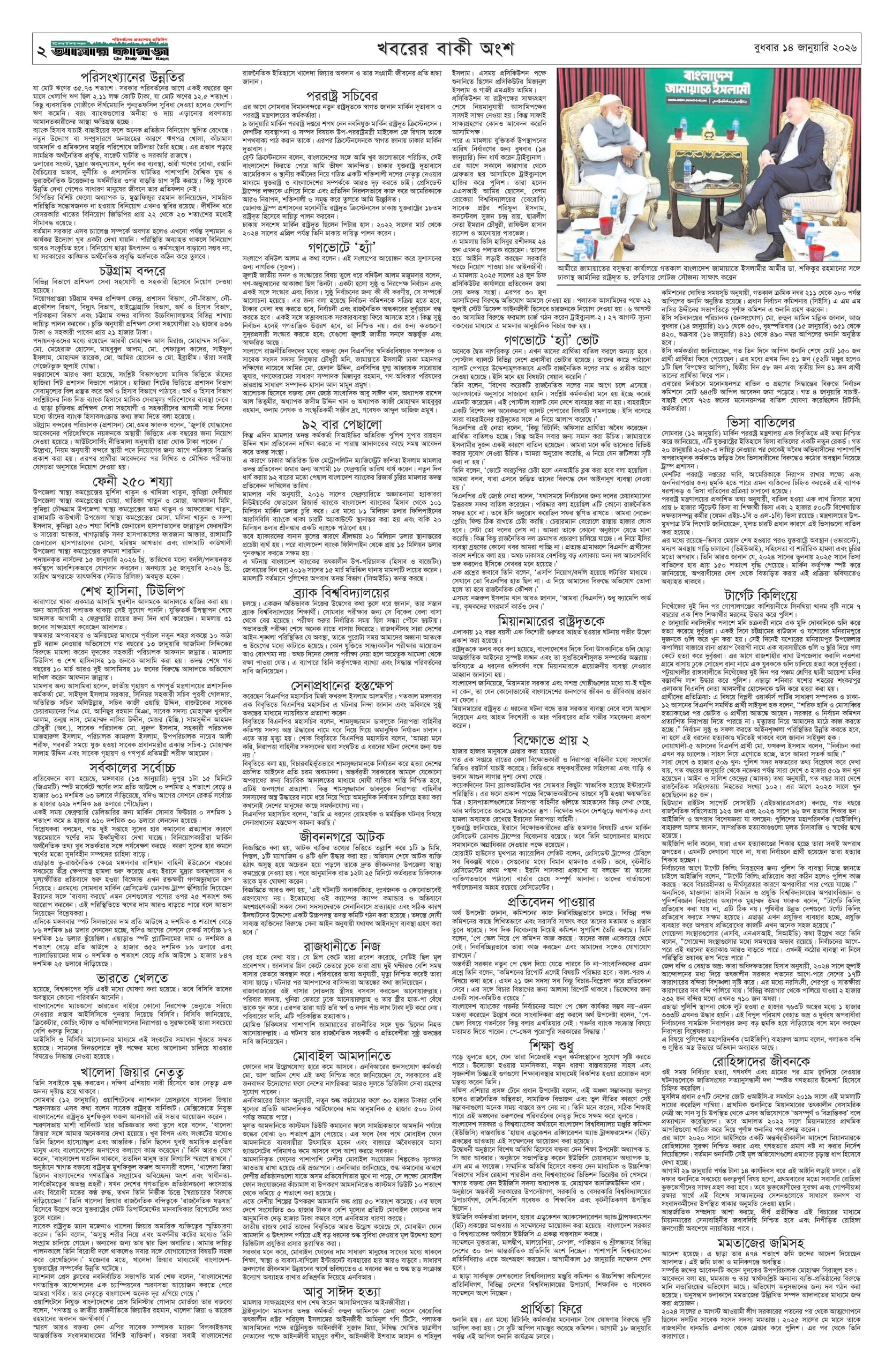 ই পেপার প্রধান সংবাদ সর্বশেষ দৈনিক আমার কাগজ ই-পেপার (বুধবার, ১৪ জানুয়ারি ২০২৬) Faruk Hossain January 14, 2026 9:48 AM Continue Reading Previous: শক্তির রাজনীতির বদলে সংলাপ চায় চীনNext: অধ্যাদেশের দাবি: ঢাকার তিন স্থানে অবরোধের ঘোষণা সাত কলেজের শিক্ষার্থীদের Leave a Reply Cancel replyYour email address will not be published. Required fields are marked *Comment * Name * Email * Website Save my name, email, and website in this browser for the next time I comment. Related Stories শিক্ষার্থীদের ক্লাসে ফেরাতে প্রয়োজনে উপবৃত্তি বাড়ানো হবে: গণশিক্ষা প্রতিমন্ত্রী প্রধান সংবাদ শিক্ষার্থীদের ক্লাসে ফেরাতে প্রয়োজনে উপবৃত্তি বাড়ানো হবে: গণশিক্ষা প্রতিমন্ত্রী April 17, 2026 4:16 PM জেলখানায় বসেই ডাকাতির পরিকল্পনা, মূল পরিকল্পনাকারীসহ গ্রেপ্তার ১৩ 1 min read অপরাধ ও দুর্নীতি জেলখানায় বসেই ডাকাতির পরিকল্পনা, মূল পরিকল্পনাকারীসহ গ্রেপ্তার ১৩ April 17, 2026 4:10 PM অতীতের ফ্যাসিবাদ থেকে আগামীর ফ্যাসিবাদ হবে আরও ভয়াবহ : ডা. শফিকুর রহমান 1 min read প্রধান সংবাদ অতীতের ফ্যাসিবাদ থেকে আগামীর ফ্যাসিবাদ হবে আরও ভয়াবহ : ডা. শফিকুর রহমান April 17, 2026 3:59 PM