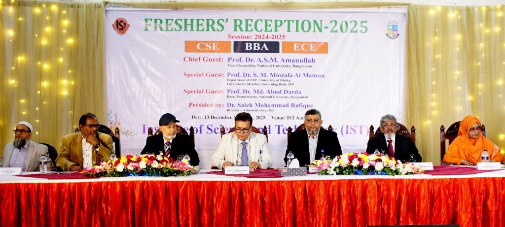 আজ শনিবার (১৩ ডিসেম্বর) সকাল ১০টায় ধানমন্ডিস্থ ইন্সটিটিউট অব সাইন্স এন্ড টেকনোলজি’র (আইএসটি) অডিটোরিয়ামে ২০২৪-২৫ শিক্ষাবর্ষের নবীন বরণ অনুষ্ঠান-২০২৫ অনুষ্ঠিত হয়। উক্ত অনুষ্ঠানে সভাপতিত্ব করেন বীর মুক্তিযোদ্ধা এবং আই.এস.টি’র পরিচালক (প্রশাসন) ও স্বাস্থ্য অধিদপ্তরের সাবেক পরিচালক ডা. সালেহ্ মুহম্মদ রফিক।