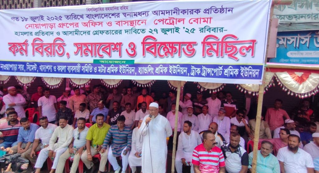 গতকাল রোববার (২৭ জুলাই) সকাল থেকে সকল দোকানপাট বন্ধ রেখে নওয়াপাড়ায় অর্ধদিবস ধর্মঘট ও বিক্ষোভ সমাবেশ অনুষ্ঠিত হয়। নওয়াপাড়া সার, সিমেন্ট, খাদ্যশস্য ও কয়লা ব্যবসায়ী সমিতি,মটর শ্রমিক ইউনিয়ন, হ্যান্ডলিং শ্রমিক ইউনিয়ন,ট্রাক ট্রান্সপোর্ট শ্রমিক ইউনিয়নের আয়োজনে সমিতির সহ সভাপতি আব্দুল আওয়াল হোসেনের সভাপতিত্বে, বক্তব্য রাখেন, নওয়াপাড়া সার, সিমেন্ট, খাদ্যশস্য ও কয়লা ব্যাবসায়ী সমিতির সাধারণ সম্পাদক শাহ জালাল হোসেন,অভয়নগর থানা বিএনপির সভাপতি ফারাজী মতিয়ার রহমান, সাধারণ সম্পাদক, গোলাম হায়দার ডাবলু, সার সমিতির সহ সভাপতি মশিয়ার রহমান, পৌর বিএনপির সভাপতি আবু নঈম মোড়ল, সাধারণ সম্পাদক রেজাউল করিম, সাবেক মেয়র রবিউল হোসেন, নওয়াপাড়া প্রেসক্লাবের সভাপতি এস এম মুজিবর রহমান, হ্যাল্ডলিং শ্রমিক ইউনিয়নের আহবায়ক মাসুদ রানা, নওয়াপাড়া মটর শ্রমিক ইউনিয়নের সদস্য সচিব রফিকুল ইসলাম টুলু,উপজেলা যুবদলের আহবায়ক বাকিউজ্জামান রানা, স্বেচ্ছাসেবক দলের আহবায়ক হাবিবুর রহমান মোল্যা। অনুষ্ঠানটি পরিচালনা করেন, ব্যবসায়ী শেখ আসাদুল্লাহ আসাদ, নূর আলম পাটোয়ারি।