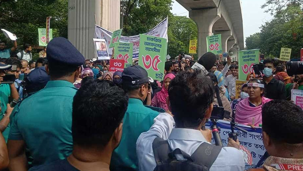 রাজধানীতে চাকরির বয়স ৩৫ করার দাবিতে আন্দোলনরত চাকরিপ্রত্যাশীদের গণভবন অভিমুখে পদযাত্রায় বাধা দিয়েছে পুলিশ।