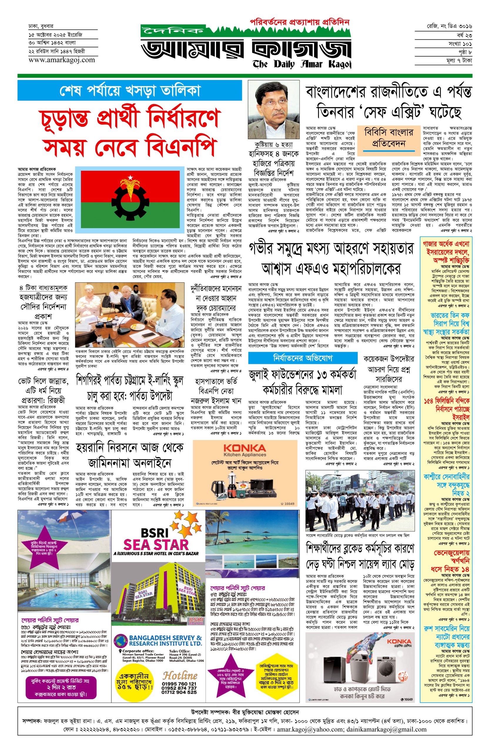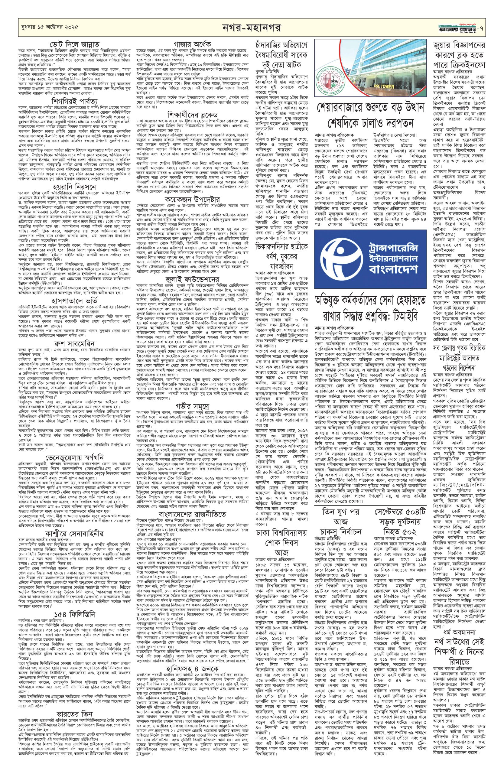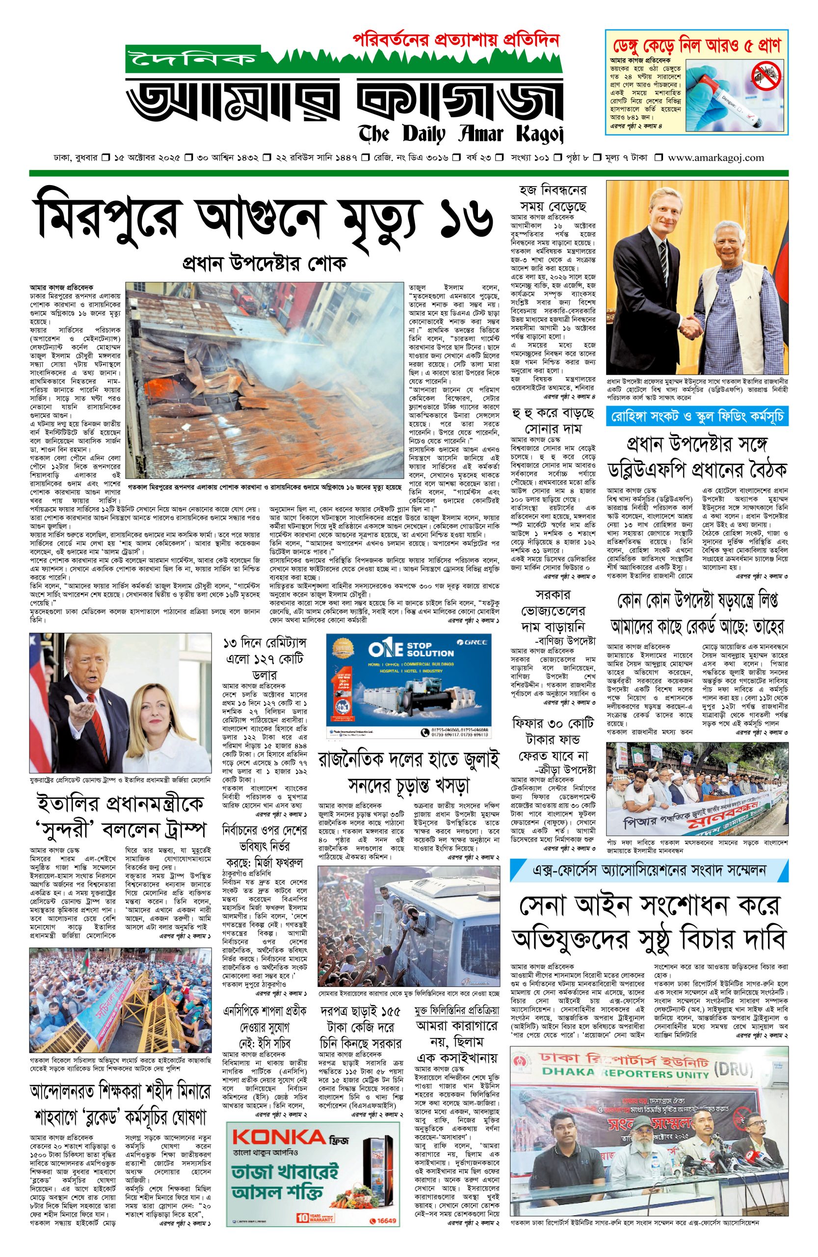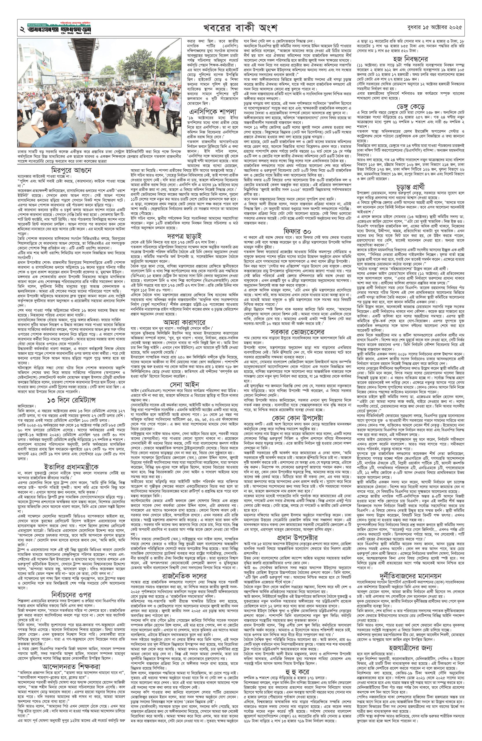 ই পেপার প্রধান সংবাদ সর্বশেষ দৈনিক আমার কাগজ ই-পেপার (বুধবার, ১৫ অক্টোবর ২০২৫) Faruk Hossain October 15, 2025 9:41 AM Continue Reading Previous: কথা রাখল না ইসরায়েল, গাজায় আবার চালালো হত্যাযজ্ঞNext: সচিব মিজানুর রহমানের মাতৃবিয়োগ Leave a Reply Cancel replyYour email address will not be published. Required fields are marked *Comment * Name * Email * Website Save my name, email, and website in this browser for the next time I comment. Related Stories সচিব মিজানুর রহমানের মাতৃবিয়োগ অন্যান্য সচিব মিজানুর রহমানের মাতৃবিয়োগ October 15, 2025 11:21 AM কথা রাখল না ইসরায়েল, গাজায় আবার চালালো হত্যাযজ্ঞ আন্তর্জাতিক কথা রাখল না ইসরায়েল, গাজায় আবার চালালো হত্যাযজ্ঞ October 14, 2025 6:49 PM সারারাত হাইকোর্টের সামনে অবস্থান করবেন শিক্ষকরা, বুধবার শাহবাগ অবরোধ 1 min read প্রধান সংবাদ সারারাত হাইকোর্টের সামনে অবস্থান করবেন শিক্ষকরা, বুধবার শাহবাগ অবরোধ October 14, 2025 6:16 PM