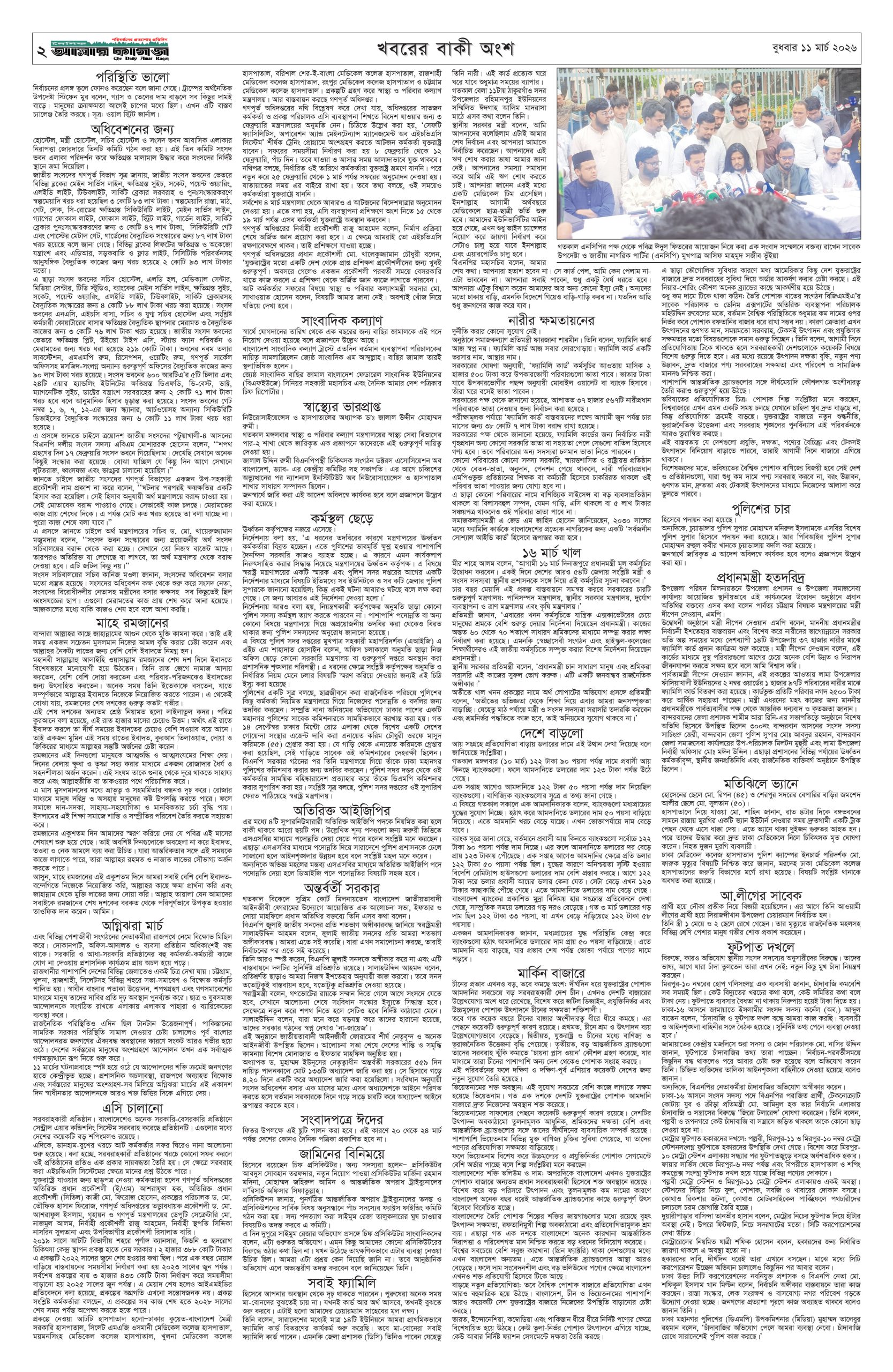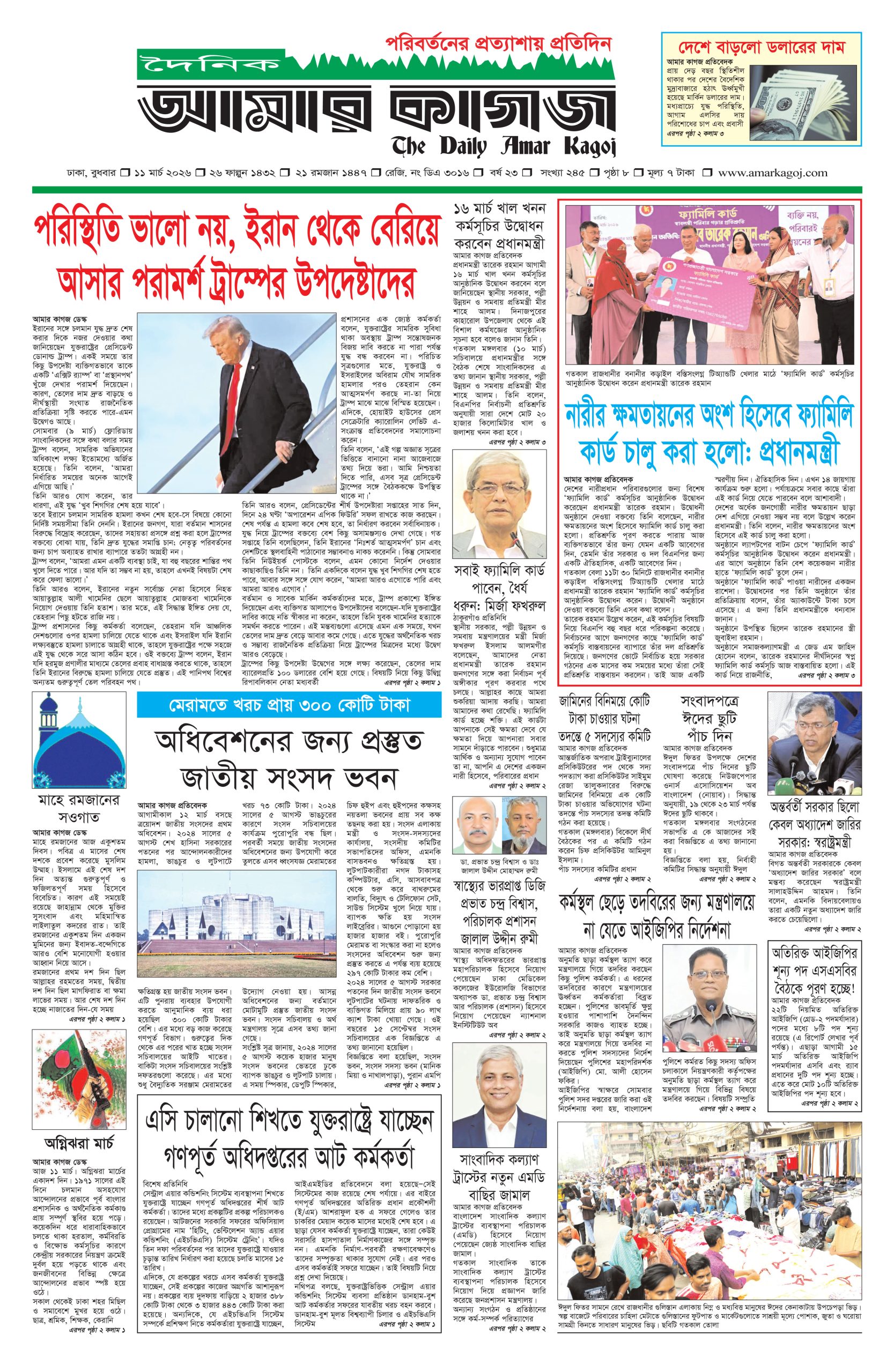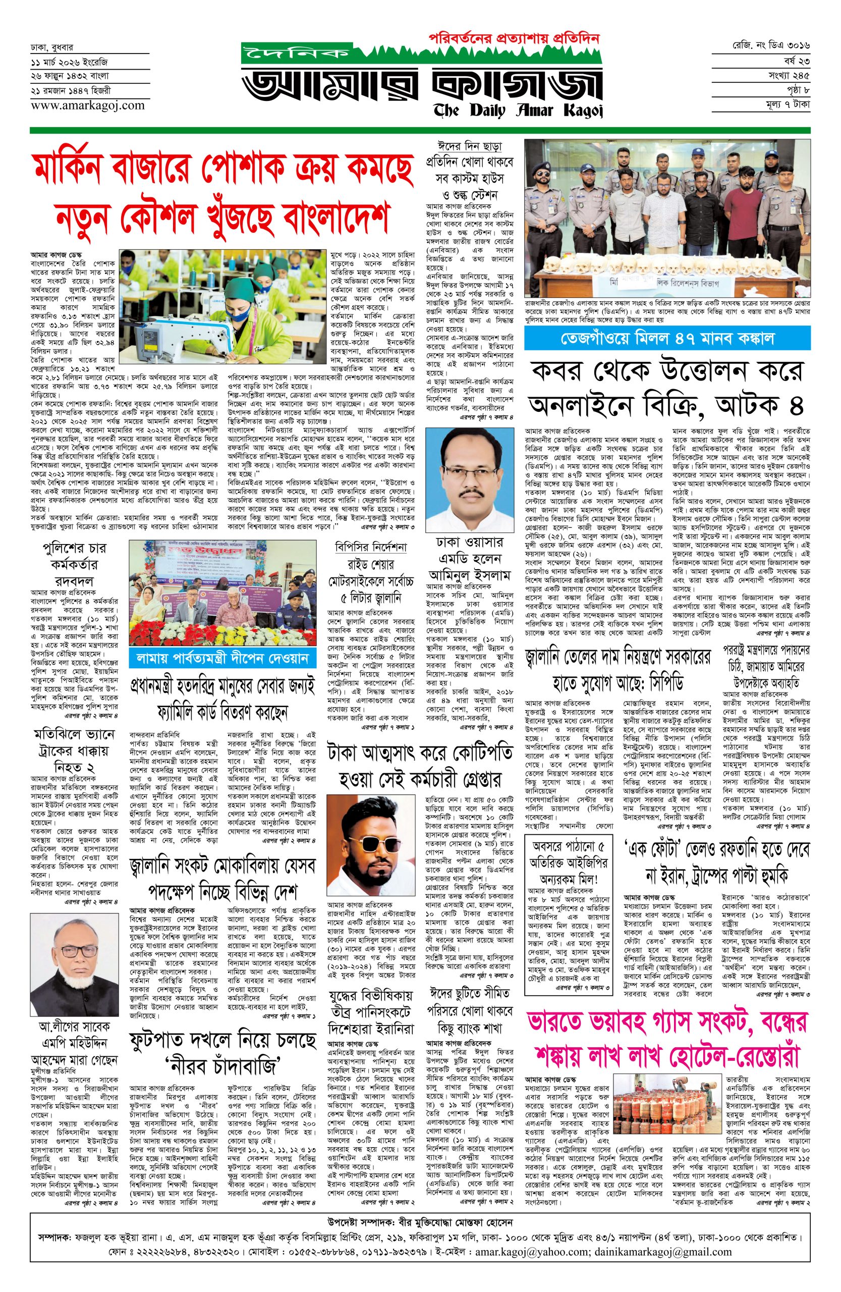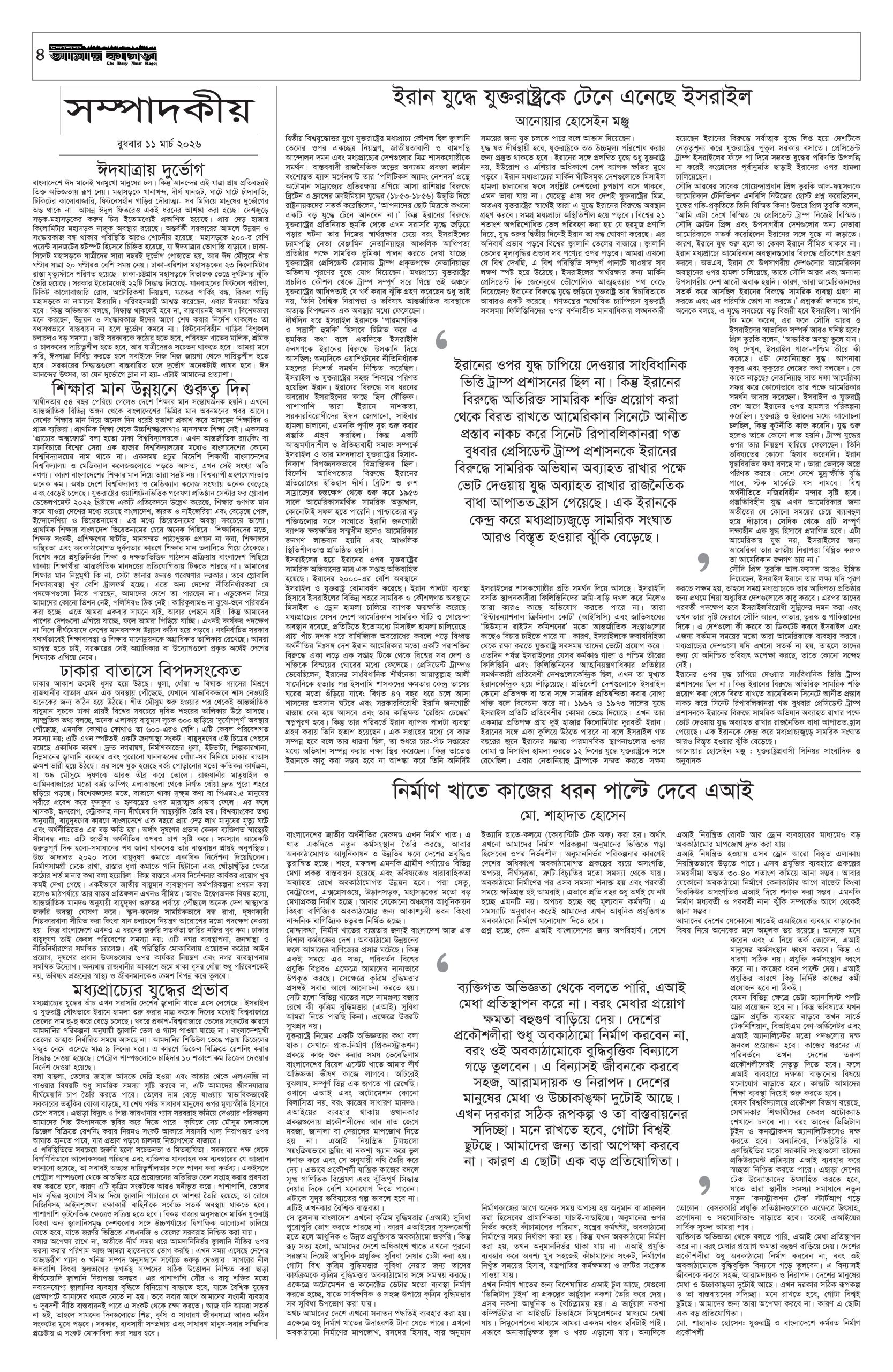 ই পেপার প্রধান সংবাদ সর্বশেষ দৈনিক আমার কাগজ ই-পেপার (বুধবার, ১১ মার্চ ২০২৬) Faruk Hossain March 11, 2026 9:52 AM Continue Reading Previous: পুলিশের ৪ কর্মকর্তার রদবদলNext: ১২ দিনে মধ্যপ্রাচ্যের ৩৯১ ফ্লাইট বাতিল Leave a Reply Cancel replyYour email address will not be published. Required fields are marked *Comment * Name * Email * Website Save my name, email, and website in this browser for the next time I comment. Related Stories দেড় ঘণ্টা পর নিয়ন্ত্রণে কেরাণীগঞ্জের আগুন দেশজুড়ে দেড় ঘণ্টা পর নিয়ন্ত্রণে কেরাণীগঞ্জের আগুন April 4, 2026 3:18 PM শহীদ জিয়ার কণ্ঠে উজ্জীবিত হয়েছিল বাঙালি জাতি দেশজুড়ে শহীদ জিয়ার কণ্ঠে উজ্জীবিত হয়েছিল বাঙালি জাতি April 4, 2026 3:07 PM পাইলট উদ্ধারে অভিযান: ব্যাপক হামলার মুখে মার্কিন যুদ্ধবিমান-হেলিকপ্টার 1 min read আন্তর্জাতিক পাইলট উদ্ধারে অভিযান: ব্যাপক হামলার মুখে মার্কিন যুদ্ধবিমান-হেলিকপ্টার April 4, 2026 2:17 PM