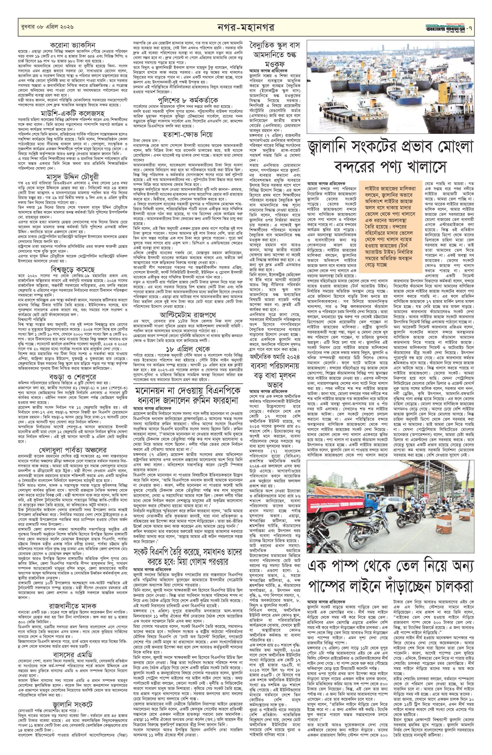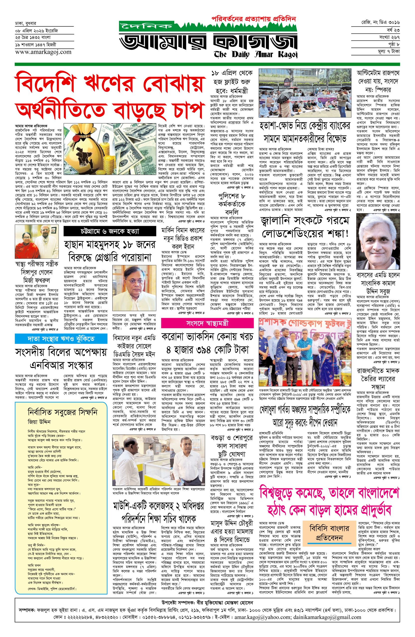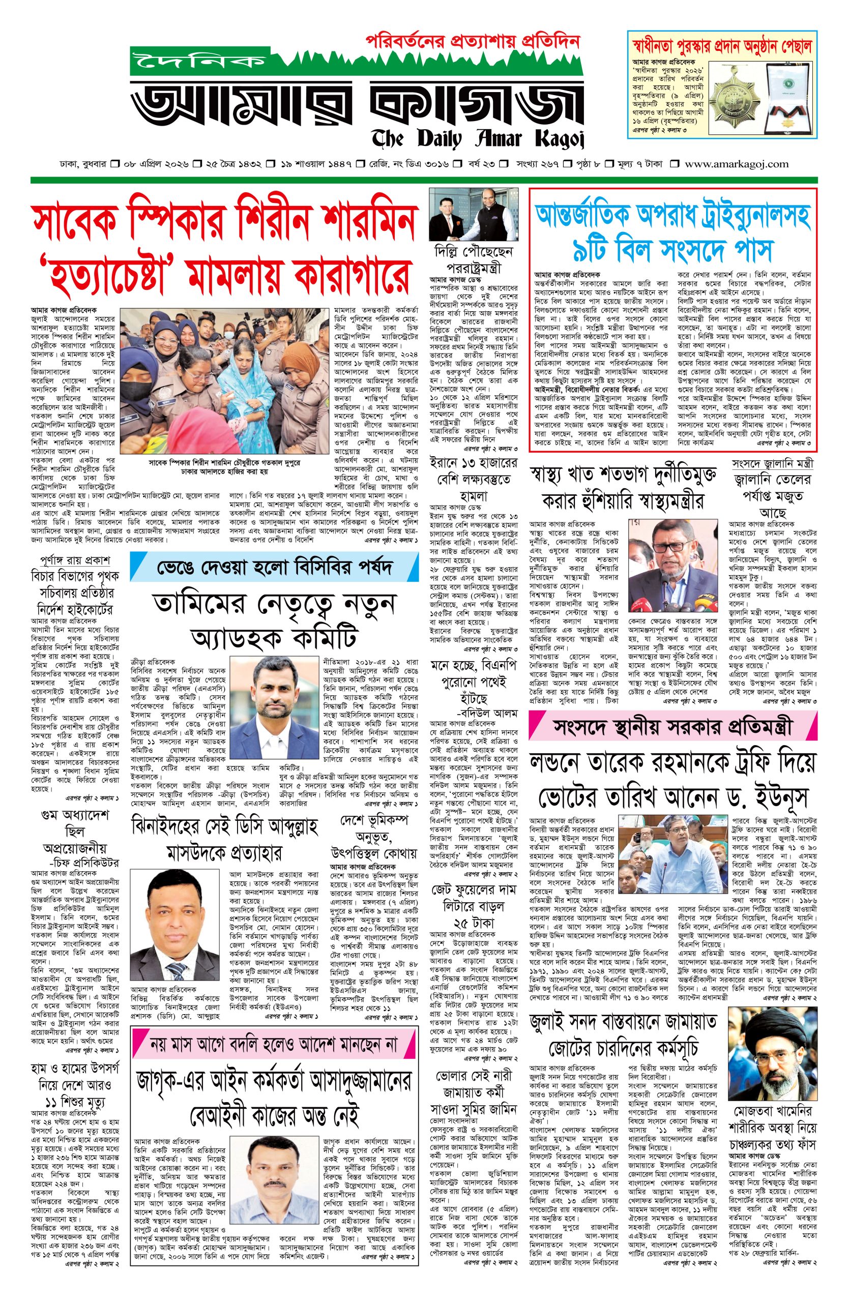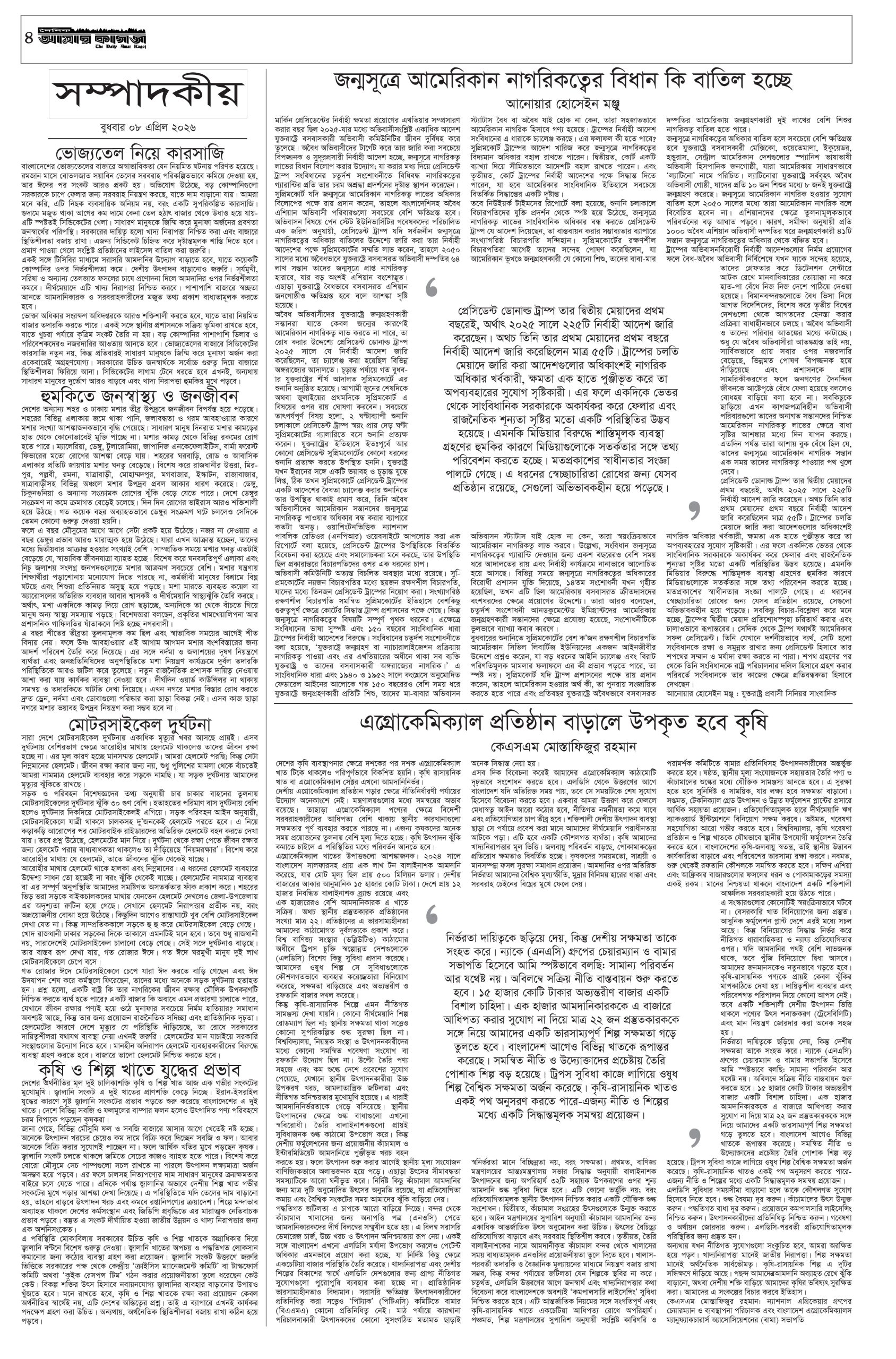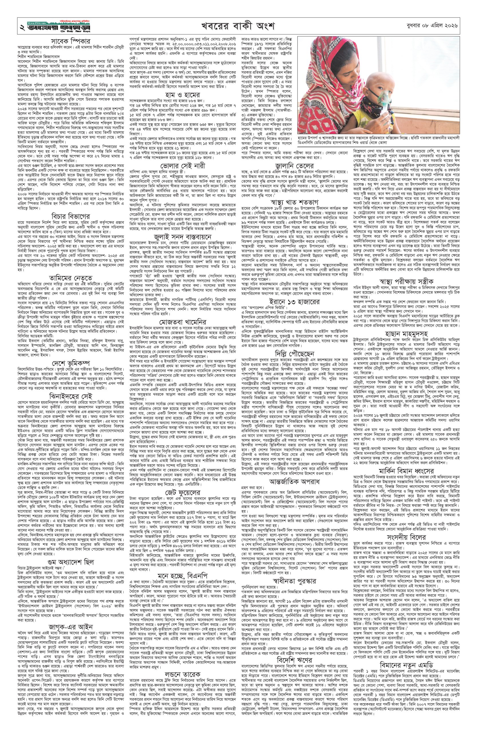 ই পেপার প্রধান সংবাদ সর্বশেষ দৈনিক আমার কাগজ ই-পেপার (বুধবার, ০৮ এপ্রিল ২০২৬) Faruk Hossain April 8, 2026 9:16 AM Continue Reading Previous: হাম ও হামের উপসর্গ নিয়ে দেশে আরও ১১ শিশুর মৃত্যুNext: রাতের মধ্যে ঢাকাসহ ২০ জেলায় ৬০ কিমি বেগে বজ্রবৃষ্টির আভাস Leave a Reply Cancel replyYour email address will not be published. Required fields are marked *Comment * Name * Email * Website Save my name, email, and website in this browser for the next time I comment. Related Stories ট্রাম্পকে ক্ষমতাচ্যুত করার ডাক যুক্তরাষ্ট্রে 1 min read আন্তর্জাতিক ট্রাম্পকে ক্ষমতাচ্যুত করার ডাক যুক্তরাষ্ট্রে April 8, 2026 10:35 AM ১৪ বছর পর রিয়াল মাদ্রিদকে হারাল বায়ার্ন মিউনিখ 1 min read ফুটবল ১৪ বছর পর রিয়াল মাদ্রিদকে হারাল বায়ার্ন মিউনিখ April 8, 2026 9:48 AM হরমুজ প্রণালি খোলার প্রস্তাবে নিরাপত্তা পরিষদে রাশিয়া ও চীনের ভেটো আন্তর্জাতিক হরমুজ প্রণালি খোলার প্রস্তাবে নিরাপত্তা পরিষদে রাশিয়া ও চীনের ভেটো April 8, 2026 9:29 AM