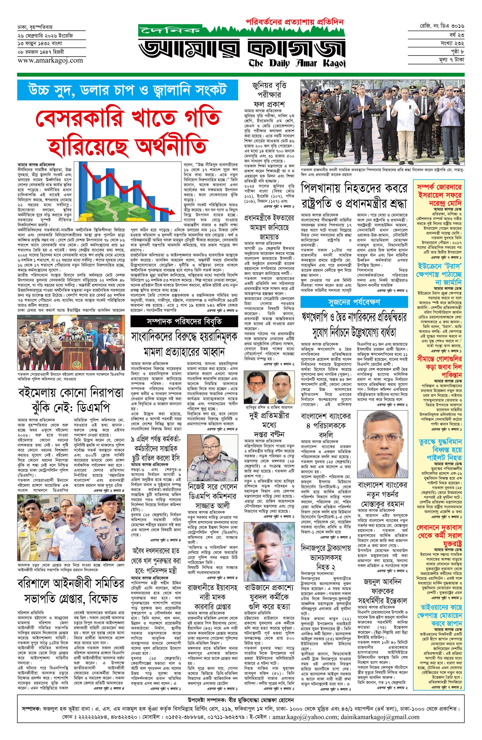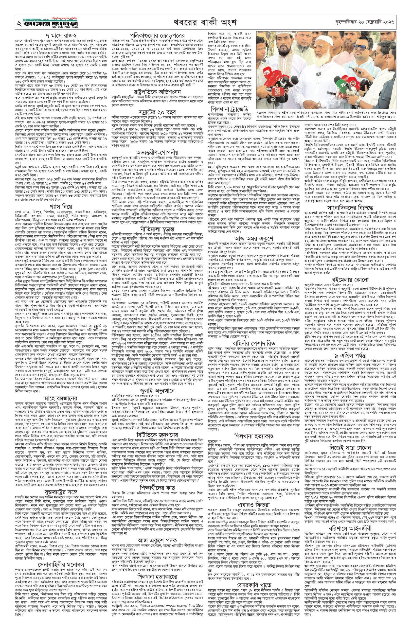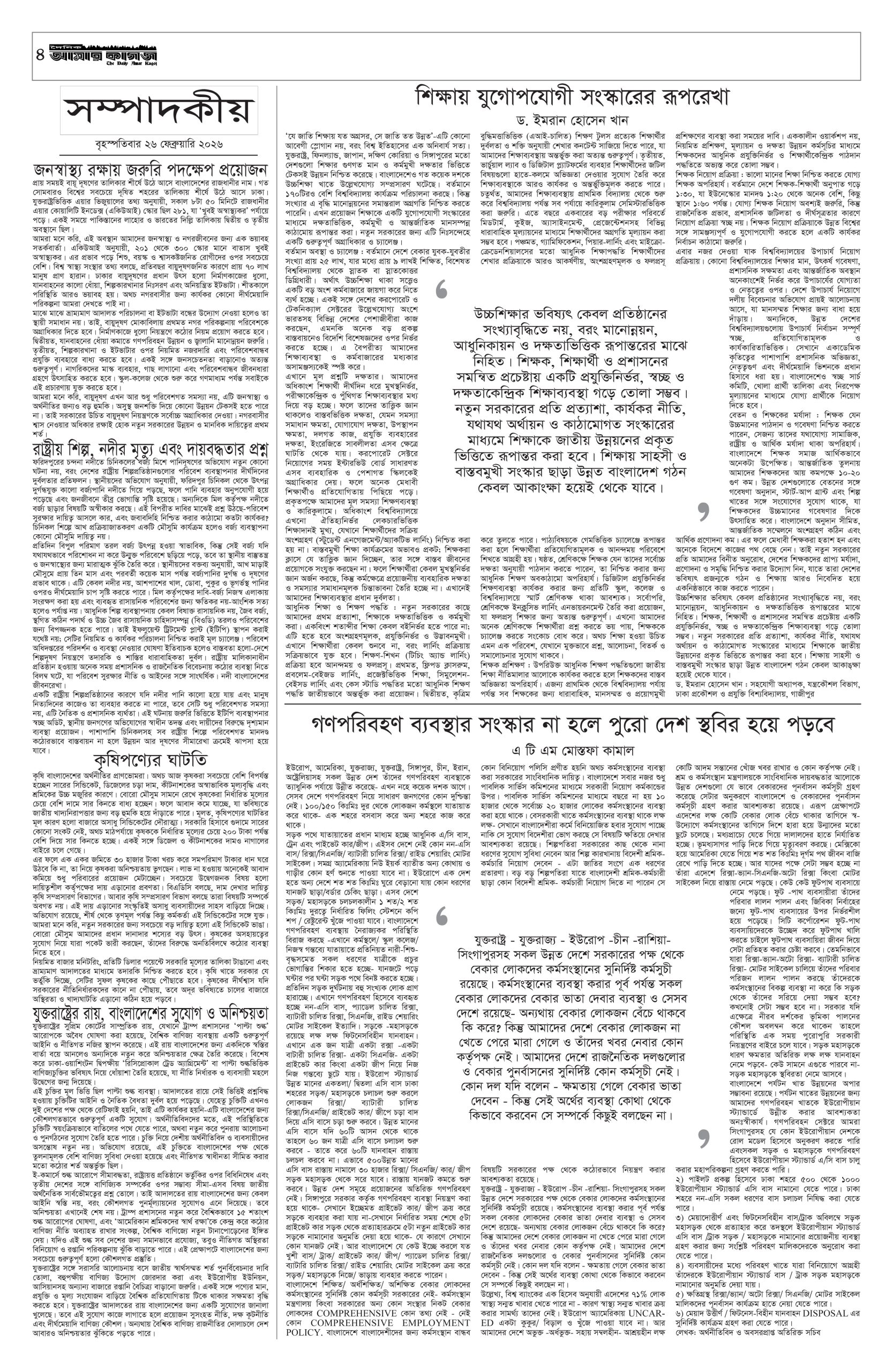 ই পেপার প্রধান সংবাদ সর্বশেষ দৈনিক আমার কাগজ ই-পেপার (বৃহস্পতিবার, ২৬ ফেব্রুয়ারি ২০২৬) Faruk Hossain February 26, 2026 9:59 AM Continue Reading Previous: বাংলাদেশ ব্যাংকের নতুন গভর্নর মোস্তাকুর রহমানকে নিয়োগNext: আজ অমর একুশে বইমেলা উদ্বোধন করবেন প্রধানমন্ত্রী Leave a Reply Cancel replyYour email address will not be published. Required fields are marked *Comment * Name * Email * Website Save my name, email, and website in this browser for the next time I comment. Related Stories শীর্ষ ব্যবসায়ীদের সঙ্গে বৈঠকে বসছেন প্রধানমন্ত্রী, গঠিত হচ্ছে ‘বেসরকারি খাত উপদেষ্টা পরিষদ’ জাতীয় শীর্ষ ব্যবসায়ীদের সঙ্গে বৈঠকে বসছেন প্রধানমন্ত্রী, গঠিত হচ্ছে ‘বেসরকারি খাত উপদেষ্টা পরিষদ’ April 4, 2026 10:22 AM আজ খোলা প্রাথমিক বিদ্যালয়, সামনের ৯ শনিবারও সাপ্তাহিক ছুটি বাতিল দেশজুড়ে আজ খোলা প্রাথমিক বিদ্যালয়, সামনের ৯ শনিবারও সাপ্তাহিক ছুটি বাতিল April 4, 2026 10:15 AM বায়তুল মোকাররমে ১১ দলীয় ঐক্য জোটের বিক্ষোভ মিছিল আজ প্রধান সংবাদ বায়তুল মোকাররমে ১১ দলীয় ঐক্য জোটের বিক্ষোভ মিছিল আজ April 4, 2026 10:00 AM