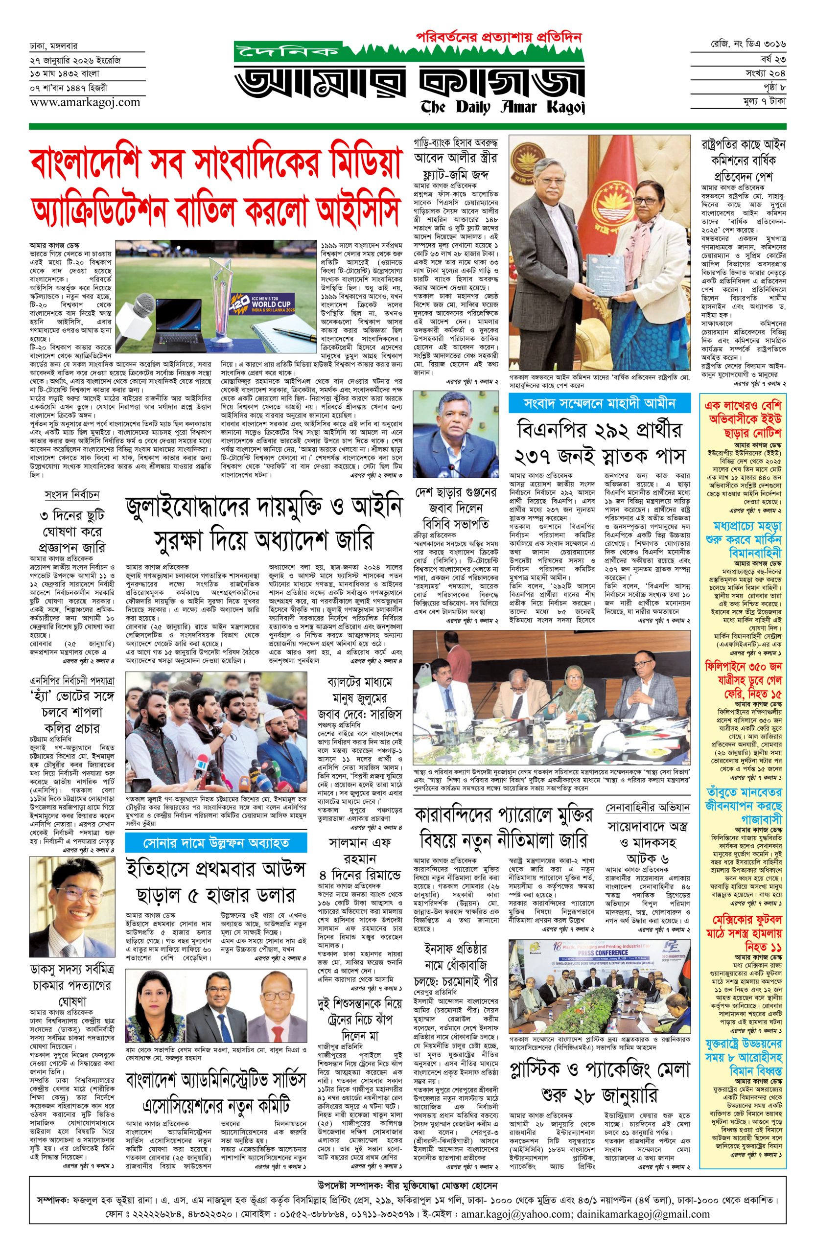 ই পেপার প্রধান সংবাদ সর্বশেষ দৈনিক আমার কাগজ ই-পেপার (মঙ্গলবার, ২৭ জানুয়ারি ২০২৬) Faruk Hossain January 27, 2026 10:12 AM Continue Reading Previous: শীতল যুদ্ধের পর সবচেয়ে কঠিন ভূ-রাজনৈতিক সময় পার করছে বিশ্বNext: তুষারঝড়-তীব্র ঠান্ডায় বিপর্যস্ত যুক্তরাষ্ট্র, ৩০ জনের মৃত্যু Leave a Reply Cancel replyYour email address will not be published. Required fields are marked *Comment * Name * Email * Website Save my name, email, and website in this browser for the next time I comment. Related Stories দৈনিক আমার কাগজ ই-পেপার (সোমবার, ০২ ফেব্রুয়ারি ২০২৬) ই পেপার দৈনিক আমার কাগজ ই-পেপার (সোমবার, ০২ ফেব্রুয়ারি ২০২৬) February 2, 2026 9:36 AM সুর, আলো ও আবেগে প্রাণবন্ত বসন্ত উৎসব গালার প্রস্তুতি 1 min read অন্যান্য সুর, আলো ও আবেগে প্রাণবন্ত বসন্ত উৎসব গালার প্রস্তুতি February 1, 2026 6:10 PM সোমবার যশোর যাচ্ছেন তারেক রহমান 1 min read প্রধান সংবাদ সোমবার যশোর যাচ্ছেন তারেক রহমান February 1, 2026 11:34 AM
