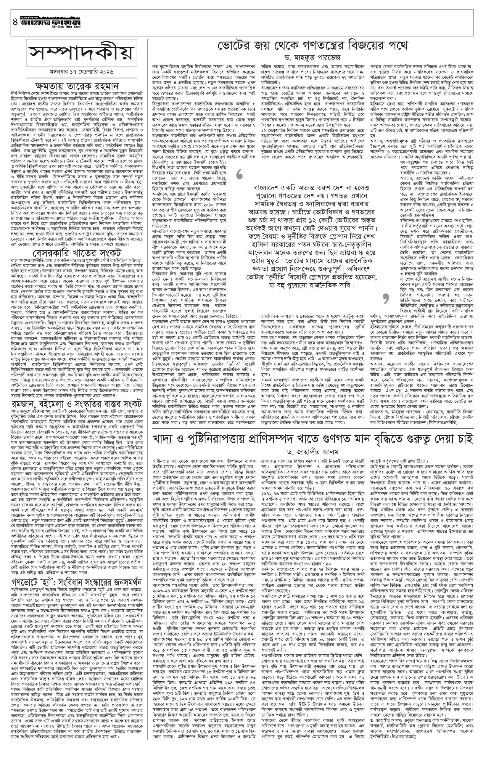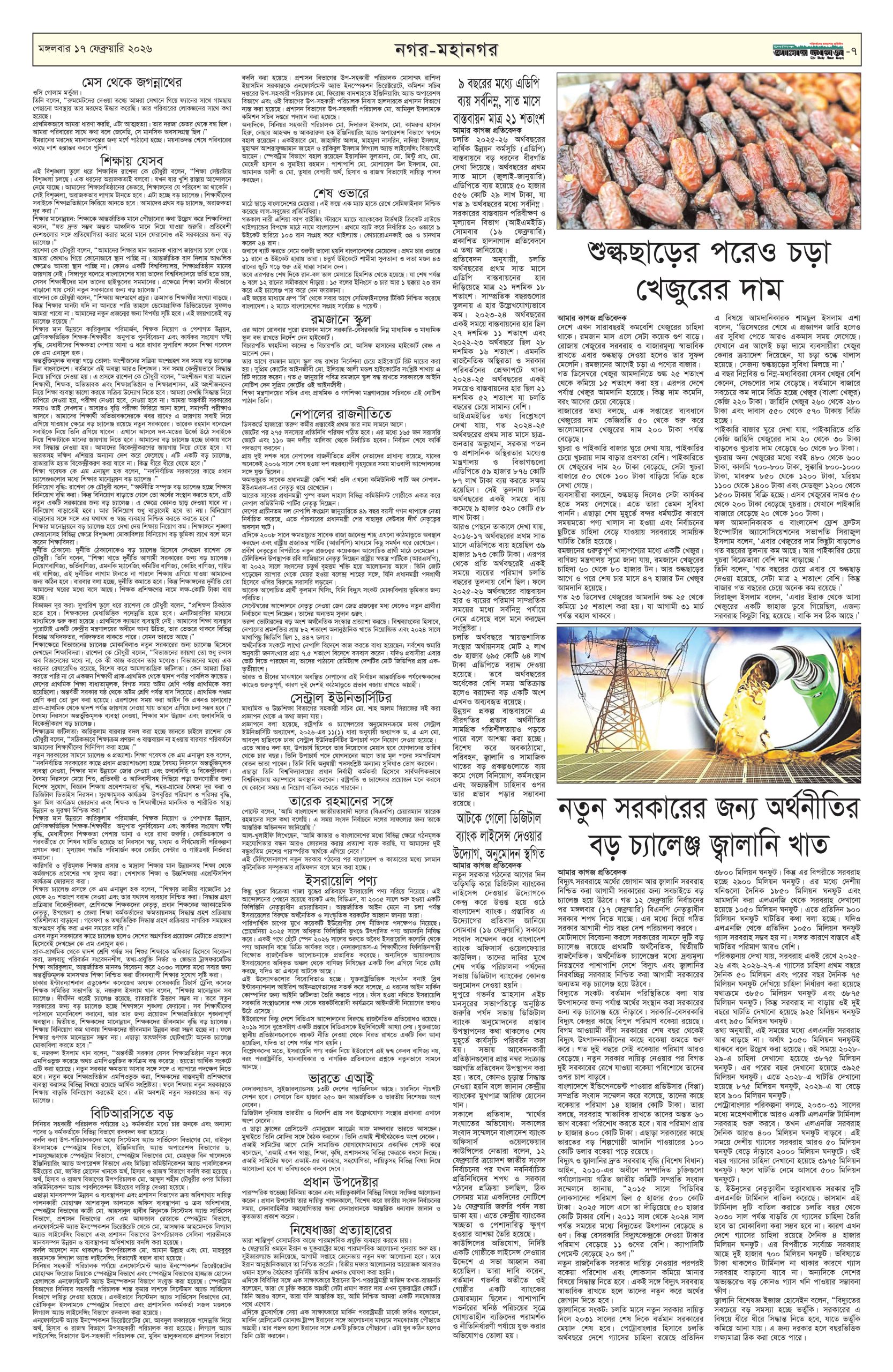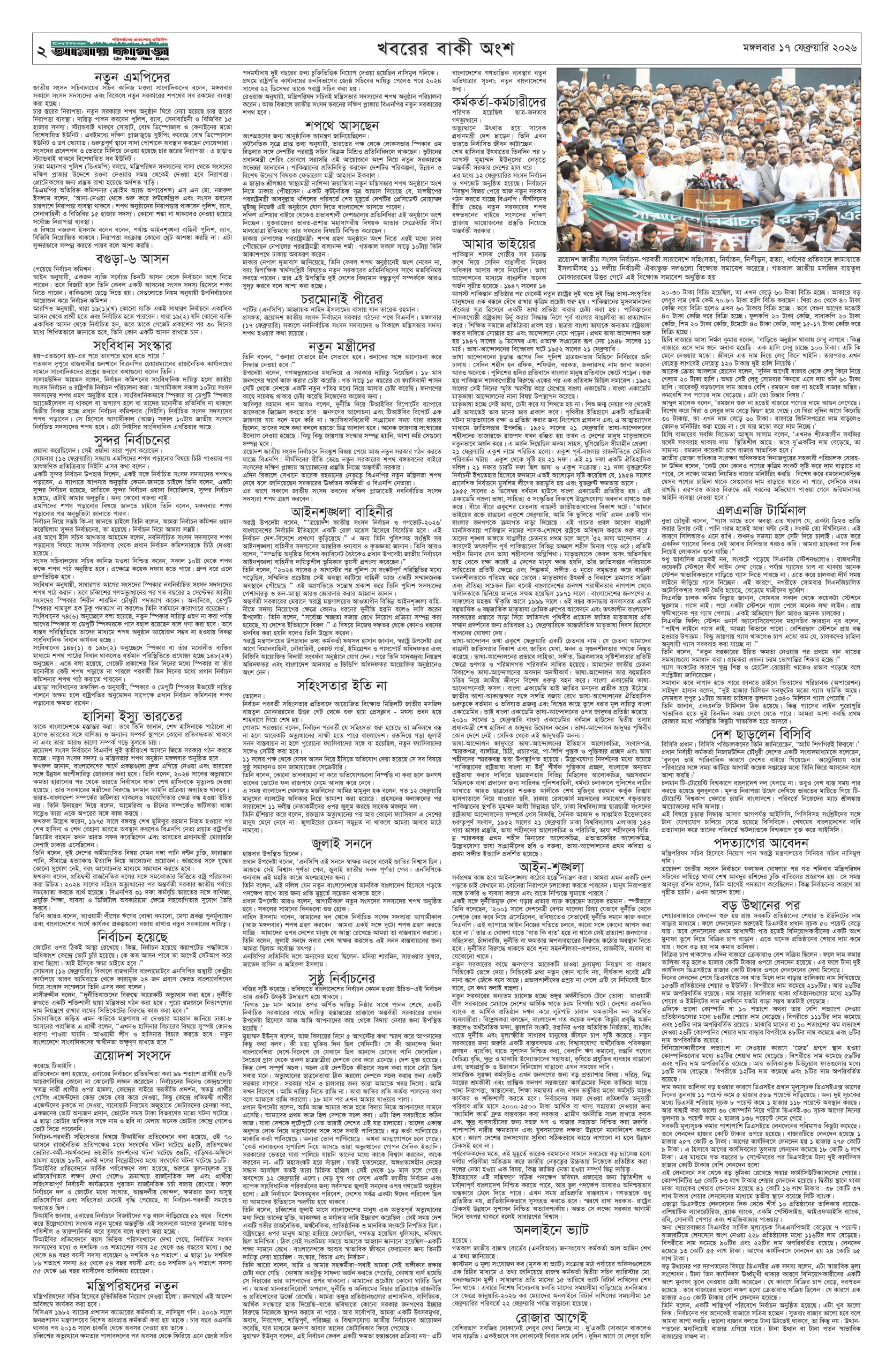 ই পেপার প্রধান সংবাদ সর্বশেষ দৈনিক আমার কাগজ ই-পেপার (মঙ্গলবার, ১৭ ফেব্রুয়ারি ২০২৬) Faruk Hossain February 17, 2026 10:07 AM Continue Reading Previous: মন্ত্রিসভায় আলোচনায় যাঁরা, কে পাচ্ছেন কোন মন্ত্রণালয়Next: কুমিল্লায় প্রবাসীর স্ত্রী ও দুই শিশুর গলাকাটা মরদেহ উদ্ধার Leave a Reply Cancel replyYour email address will not be published. Required fields are marked *Comment * Name * Email * Website Save my name, email, and website in this browser for the next time I comment. Related Stories মেয়ে জাইমাকে নিয়ে ‘বনলতা এক্সপ্রেস’ দেখতে সিনেমা হলে প্রধানমন্ত্রী 1 min read প্রধান সংবাদ মেয়ে জাইমাকে নিয়ে ‘বনলতা এক্সপ্রেস’ দেখতে সিনেমা হলে প্রধানমন্ত্রী April 3, 2026 10:49 PM জ্বালানির মূল্য নিয়ে সহসা একটি সিদ্ধান্ত আসতে পারে: অর্থমন্ত্রী 1 min read জাতীয় জ্বালানির মূল্য নিয়ে সহসা একটি সিদ্ধান্ত আসতে পারে: অর্থমন্ত্রী April 3, 2026 10:39 PM ১৯ দিনে হামের উপসর্গ নিয়ে ৯৪ শিশুর মৃত্যু জাতীয় ১৯ দিনে হামের উপসর্গ নিয়ে ৯৪ শিশুর মৃত্যু April 3, 2026 10:38 PM