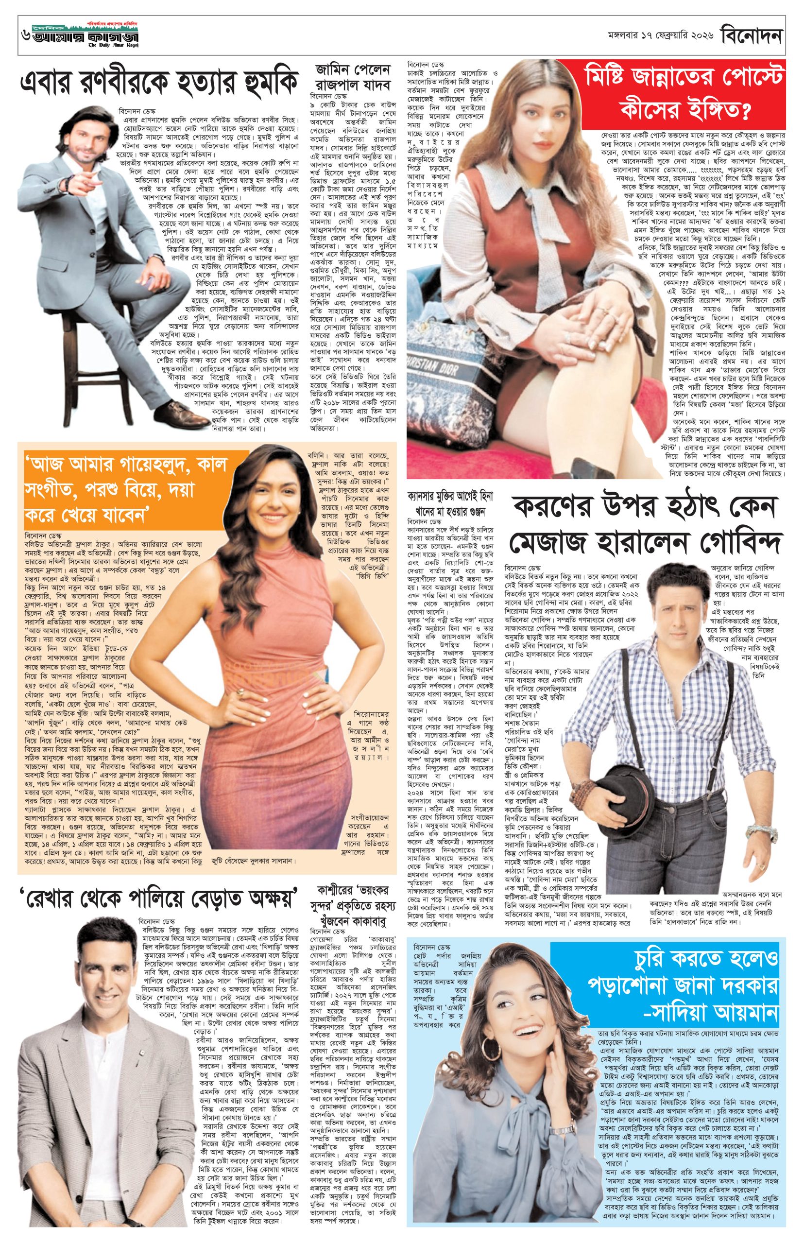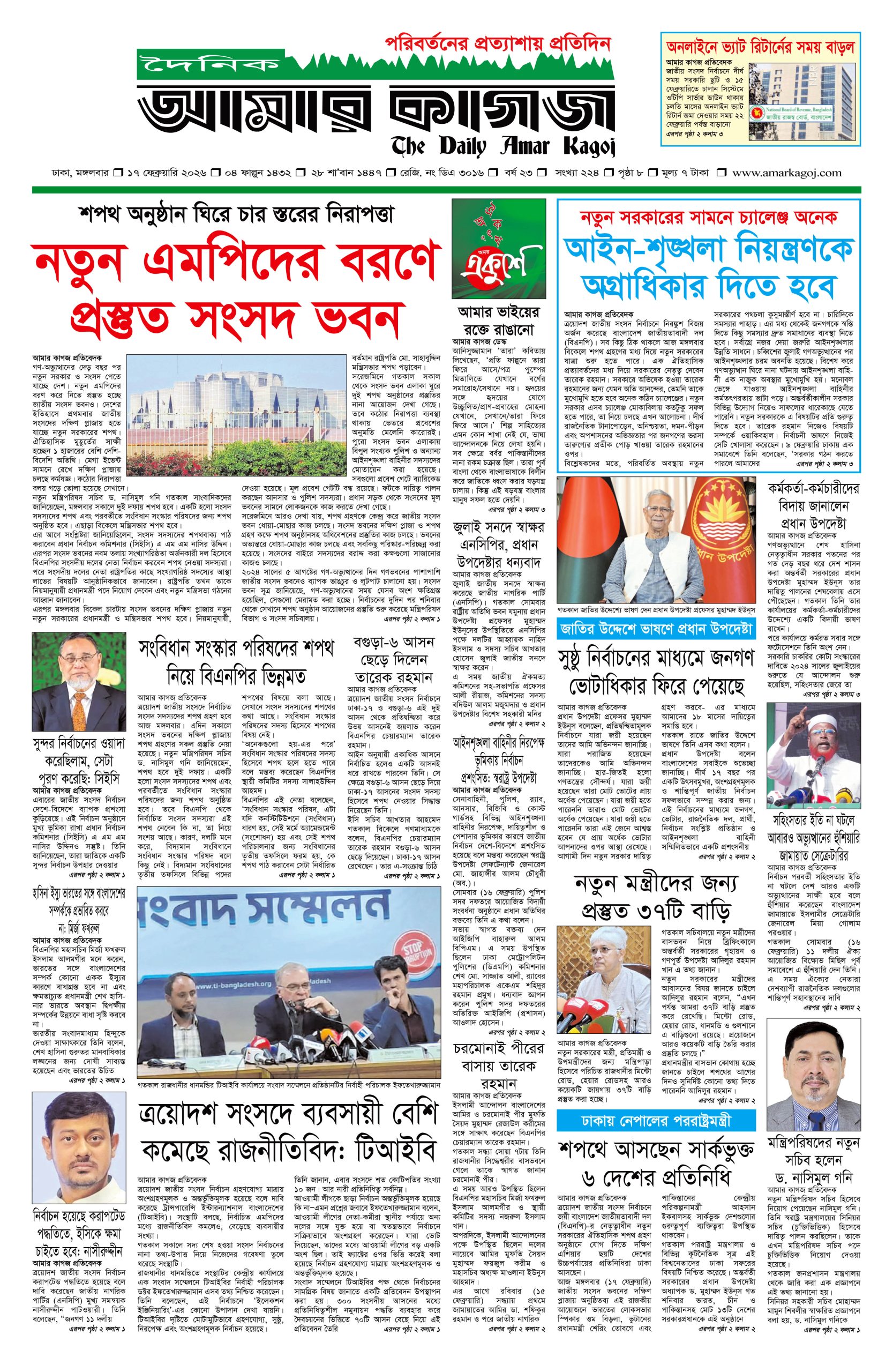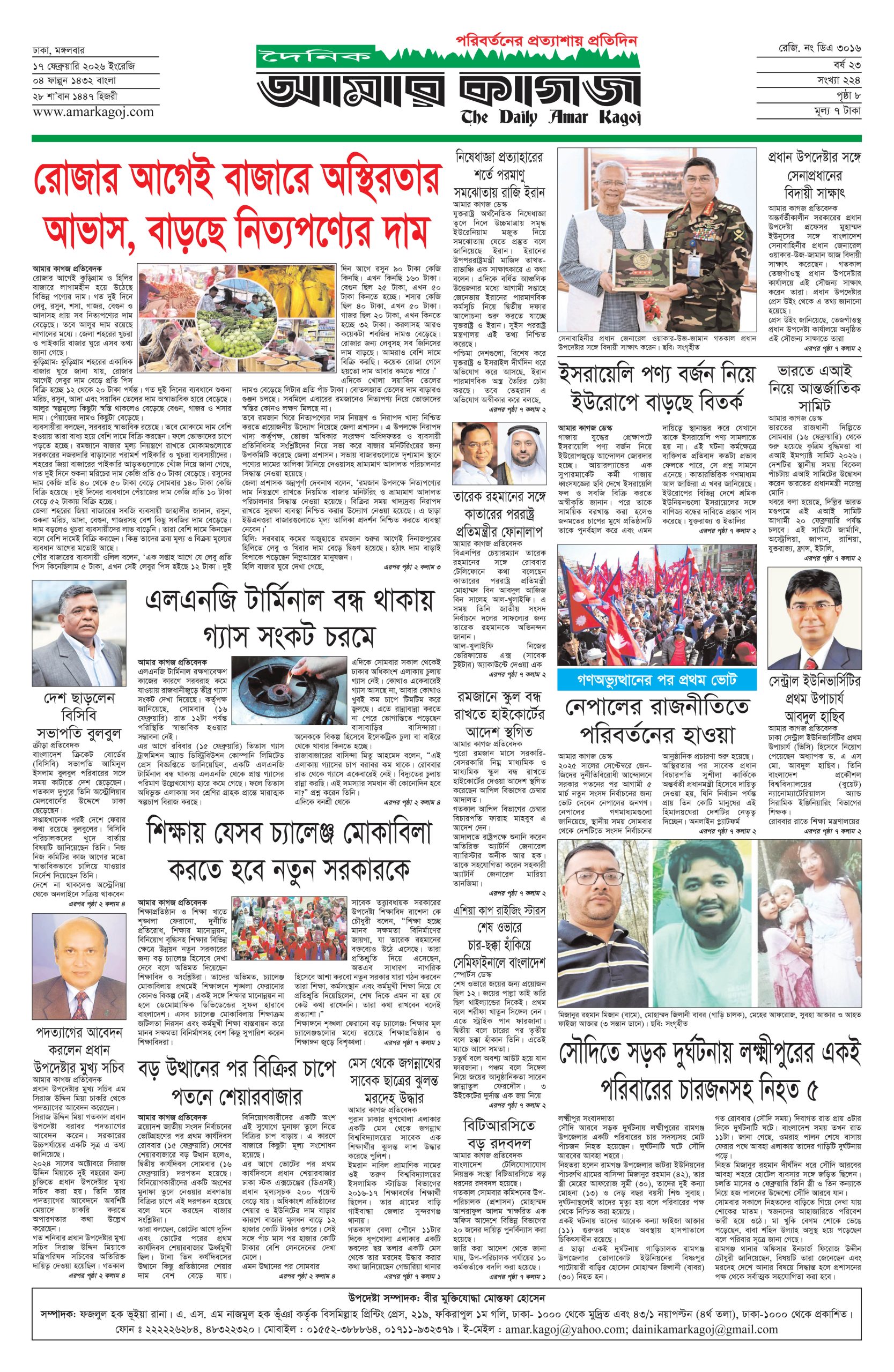 ই পেপার প্রধান সংবাদ সর্বশেষ দৈনিক আমার কাগজ ই-পেপার (মঙ্গলবার, ১৭ ফেব্রুয়ারি ২০২৬) Faruk Hossain February 17, 2026 10:07 AM Continue Reading Previous: মন্ত্রিসভায় আলোচনায় যাঁরা, কে পাচ্ছেন কোন মন্ত্রণালয়Next: কুমিল্লায় প্রবাসীর স্ত্রী ও দুই শিশুর গলাকাটা মরদেহ উদ্ধার Leave a Reply Cancel replyYour email address will not be published. Required fields are marked *Comment * Name * Email * Website Save my name, email, and website in this browser for the next time I comment. Related Stories মেয়ে জাইমাকে নিয়ে ‘বনলতা এক্সপ্রেস’ দেখতে সিনেমা হলে প্রধানমন্ত্রী 1 min read প্রধান সংবাদ মেয়ে জাইমাকে নিয়ে ‘বনলতা এক্সপ্রেস’ দেখতে সিনেমা হলে প্রধানমন্ত্রী April 3, 2026 10:49 PM জ্বালানির মূল্য নিয়ে সহসা একটি সিদ্ধান্ত আসতে পারে: অর্থমন্ত্রী 1 min read জাতীয় জ্বালানির মূল্য নিয়ে সহসা একটি সিদ্ধান্ত আসতে পারে: অর্থমন্ত্রী April 3, 2026 10:39 PM ১৯ দিনে হামের উপসর্গ নিয়ে ৯৪ শিশুর মৃত্যু জাতীয় ১৯ দিনে হামের উপসর্গ নিয়ে ৯৪ শিশুর মৃত্যু April 3, 2026 10:38 PM