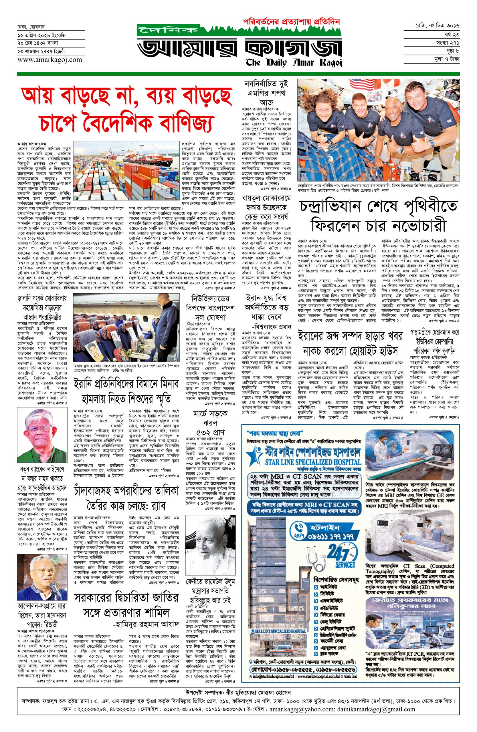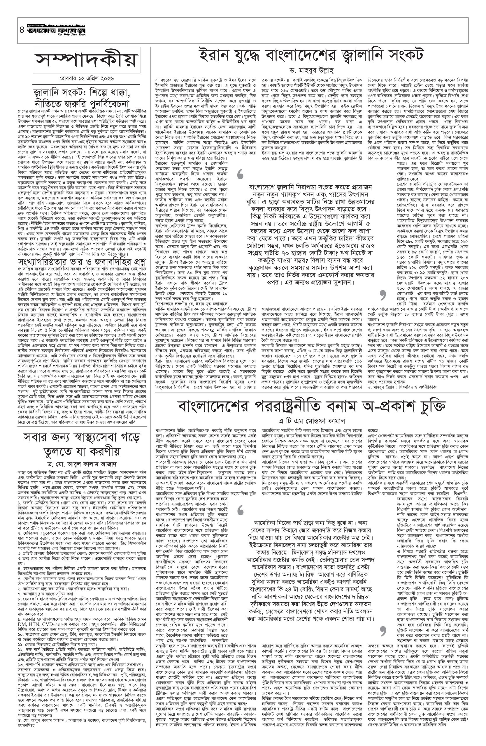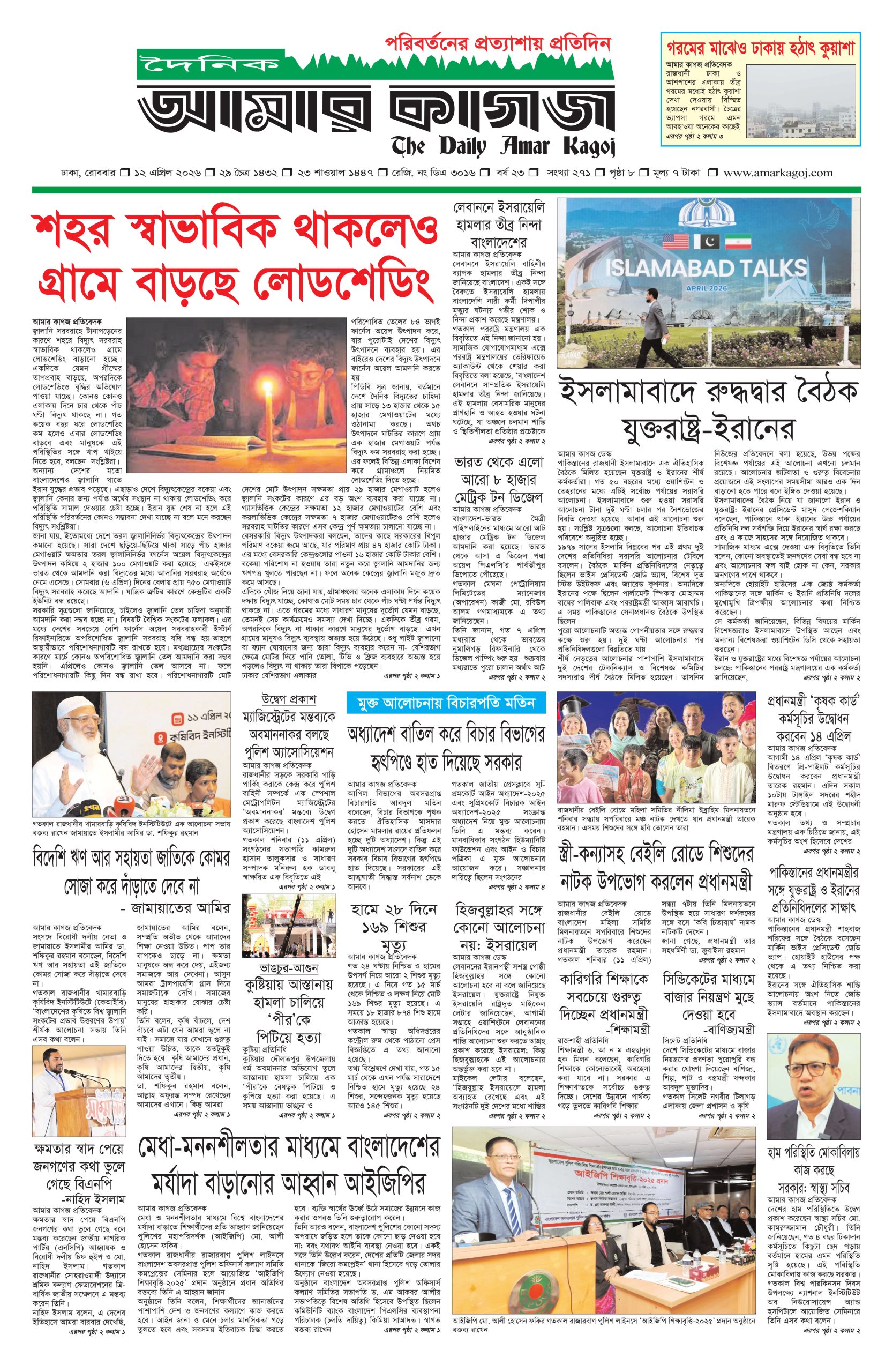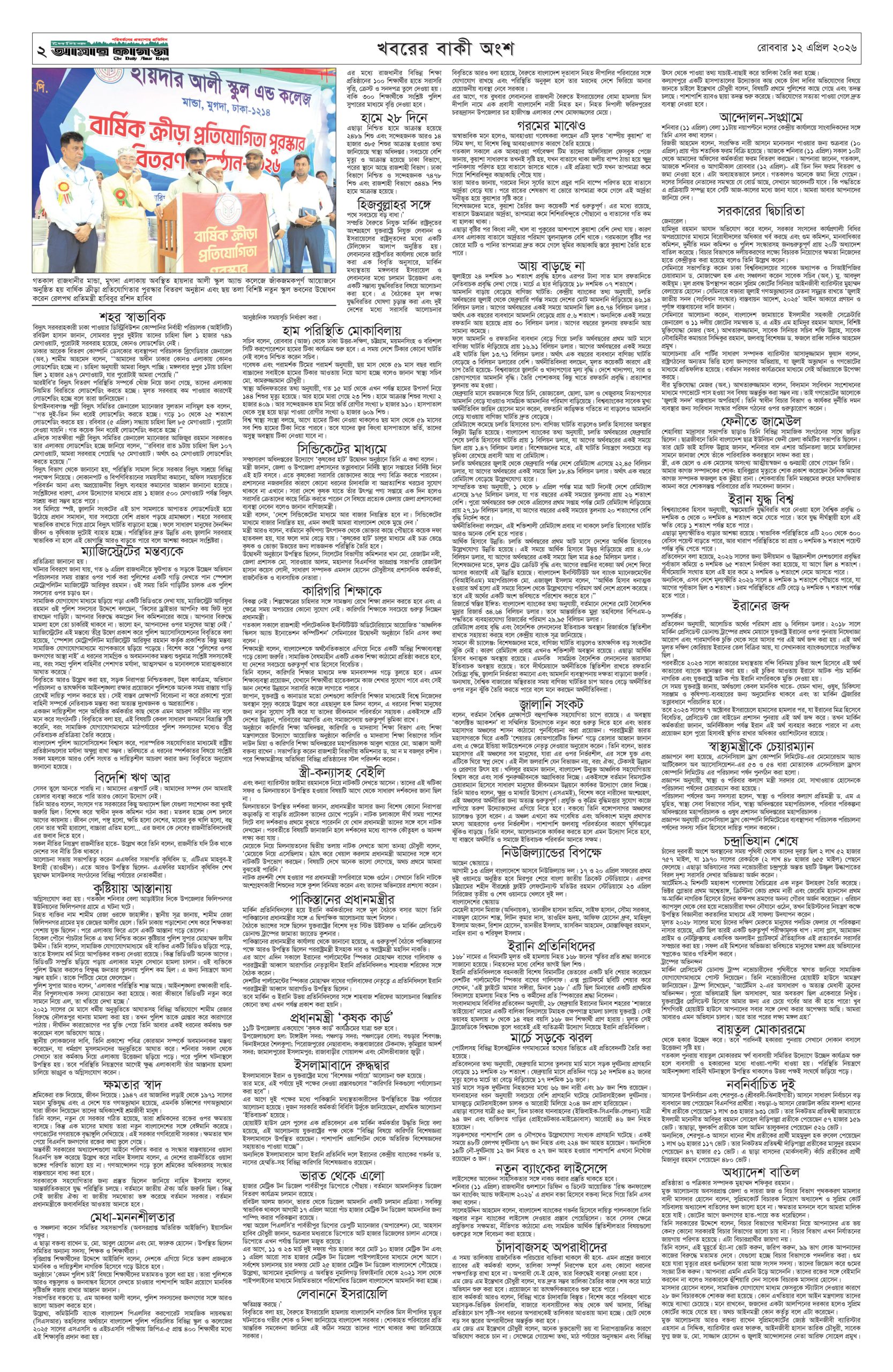 ই পেপার প্রধান সংবাদ সর্বশেষ দৈনিক আমার কাগজ ই-পেপার (রোববার, ১২ এপ্রিল ২০২৬) Faruk Hossain April 12, 2026 9:21 AM Continue Reading Previous: ইরানের জব্দকৃত সম্পদ ছাড়ছে না যুক্তরাষ্ট্র: হোয়াইট হাউসNext: ফেনীর জামেউল উলূম মাদ্রাসার সভাপতি হাবিবুল্লাহ আর নেই Leave a Reply Cancel replyYour email address will not be published. Required fields are marked *Comment * Name * Email * Website Save my name, email, and website in this browser for the next time I comment. Related Stories ‘হরমুজ প্রণালিতে টহল দেওয়া যুক্তরাষ্ট্রের কাজ নয়’ আন্তর্জাতিক ‘হরমুজ প্রণালিতে টহল দেওয়া যুক্তরাষ্ট্রের কাজ নয়’ April 12, 2026 10:52 AM তেলের জন্য লাইনে দাঁড়িয়ে হৃদরোগে স্কুল শিক্ষকের মৃত্যু দেশজুড়ে তেলের জন্য লাইনে দাঁড়িয়ে হৃদরোগে স্কুল শিক্ষকের মৃত্যু April 12, 2026 10:47 AM রাজধানীর বনানীতে হাম-রুবেলা টিকাদান ক্যাম্পেইনের উদ্বোধন রাজধানী রাজধানীর বনানীতে হাম-রুবেলা টিকাদান ক্যাম্পেইনের উদ্বোধন April 12, 2026 10:41 AM
