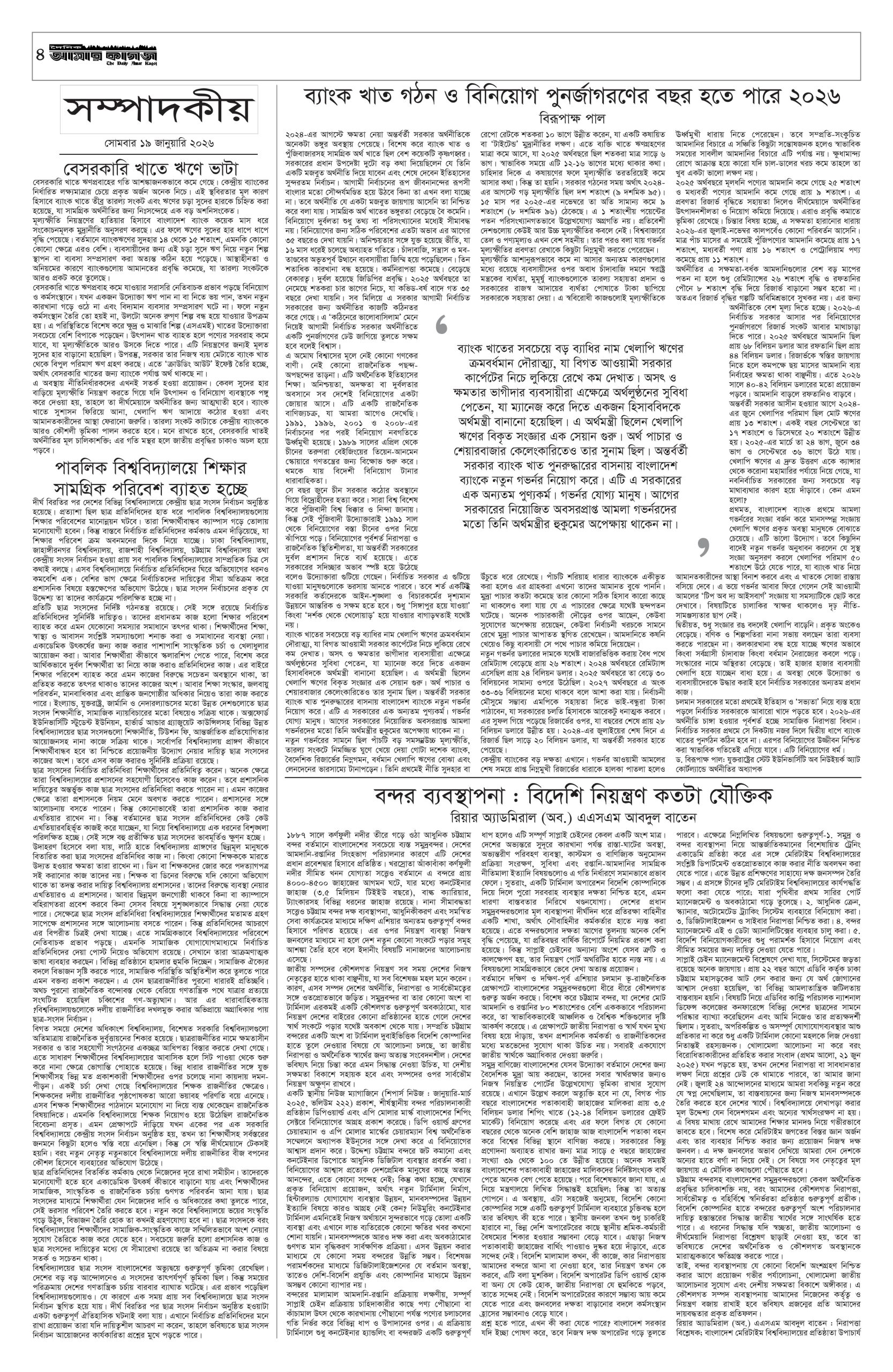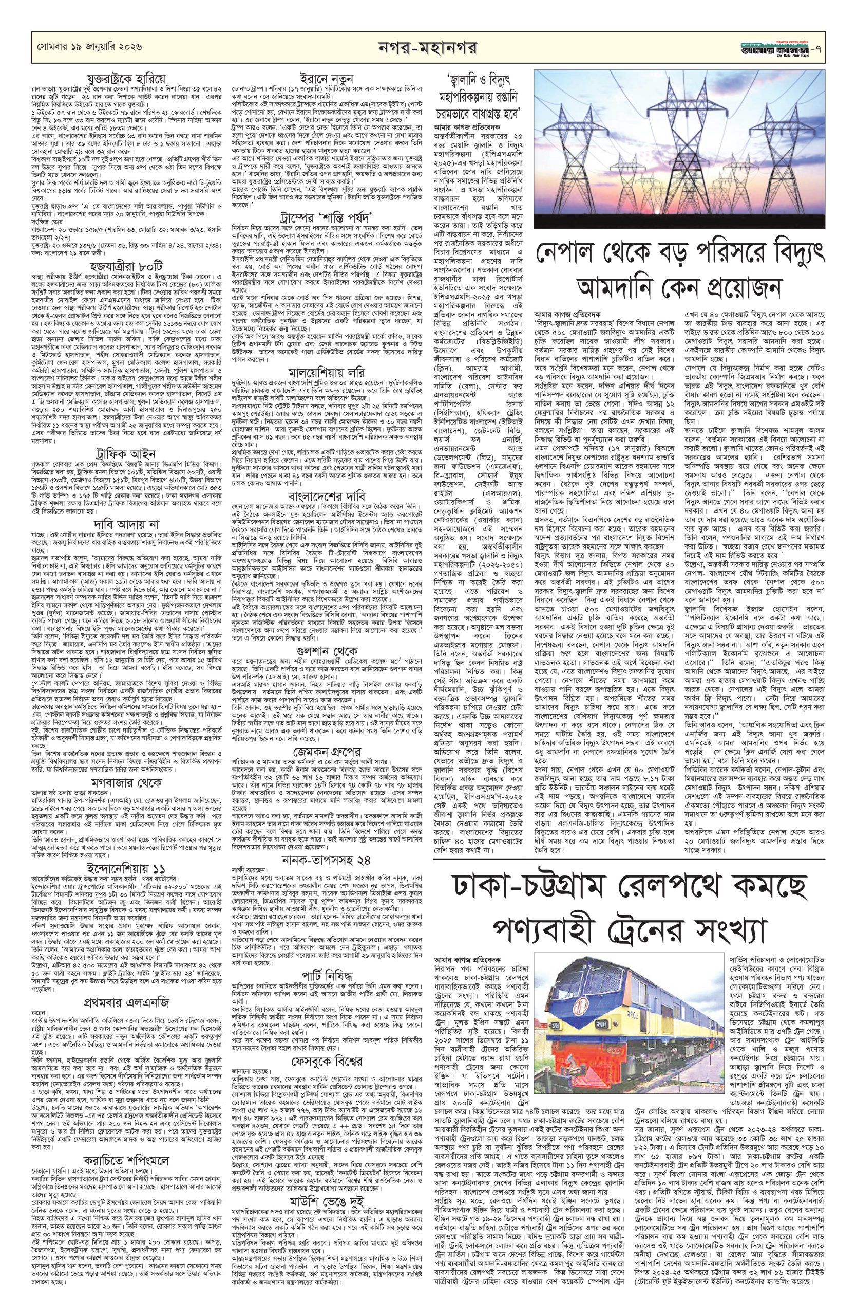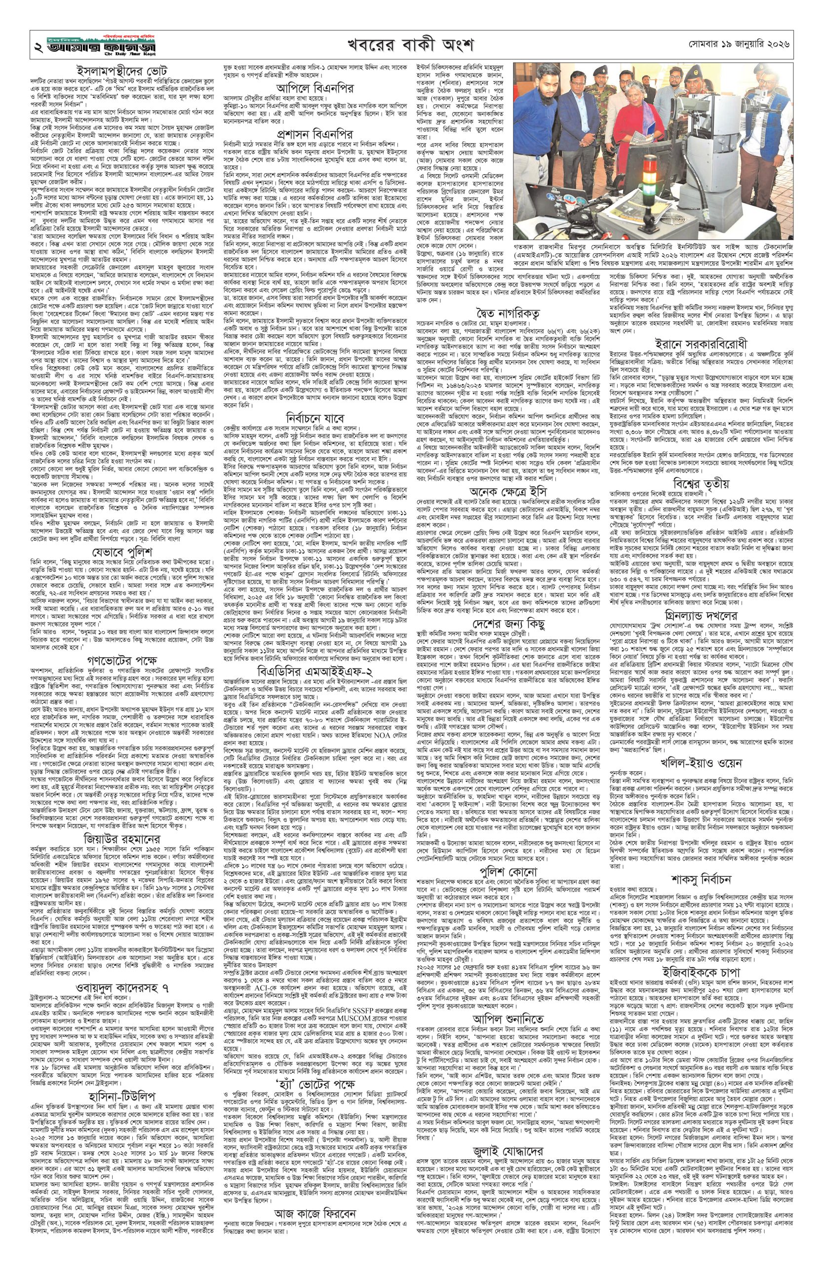 ই পেপার প্রধান সংবাদ সর্বশেষ দৈনিক আমার কাগজ ই-পেপার (সোমবার, ১৯ জানুয়ারি ২০২৬) Faruk Hossain January 19, 2026 9:36 AM Continue Reading Previous: ‘মব’ বলা নিয়ে সতর্ক করলেন তাজুল, ‘থ্রেট’ হিসেবে দেখছেন রাজনীতিবিদেরাNext: স্পেনে ভয়াবহ ট্রেন দুর্ঘটনা, নিহত অন্তত ২১ Leave a Reply Cancel replyYour email address will not be published. Required fields are marked *Comment * Name * Email * Website Save my name, email, and website in this browser for the next time I comment. Related Stories ঢাকার মশা মারাও আটকে যাচ্ছে ডিজেলের কারণে ড্রিঞ্জা চাম্বুগং 1 min read প্রধান সংবাদ ঢাকার মশা মারাও আটকে যাচ্ছে ডিজেলের কারণে ড্রিঞ্জা চাম্বুগং April 3, 2026 12:48 PM কালীগঞ্জে গৃহবধূর রহস্যজনক মৃত্যু, হাসপাতাল চত্বরে দুই পরিবারের সংঘর্ষ 1 min read দেশজুড়ে কালীগঞ্জে গৃহবধূর রহস্যজনক মৃত্যু, হাসপাতাল চত্বরে দুই পরিবারের সংঘর্ষ April 3, 2026 12:27 PM হরমুজ প্রণালি সচল করতে যুক্তরাজ্যের নেতৃত্বে ৪০ দেশের বৈঠক আন্তর্জাতিক হরমুজ প্রণালি সচল করতে যুক্তরাজ্যের নেতৃত্বে ৪০ দেশের বৈঠক April 3, 2026 12:16 PM