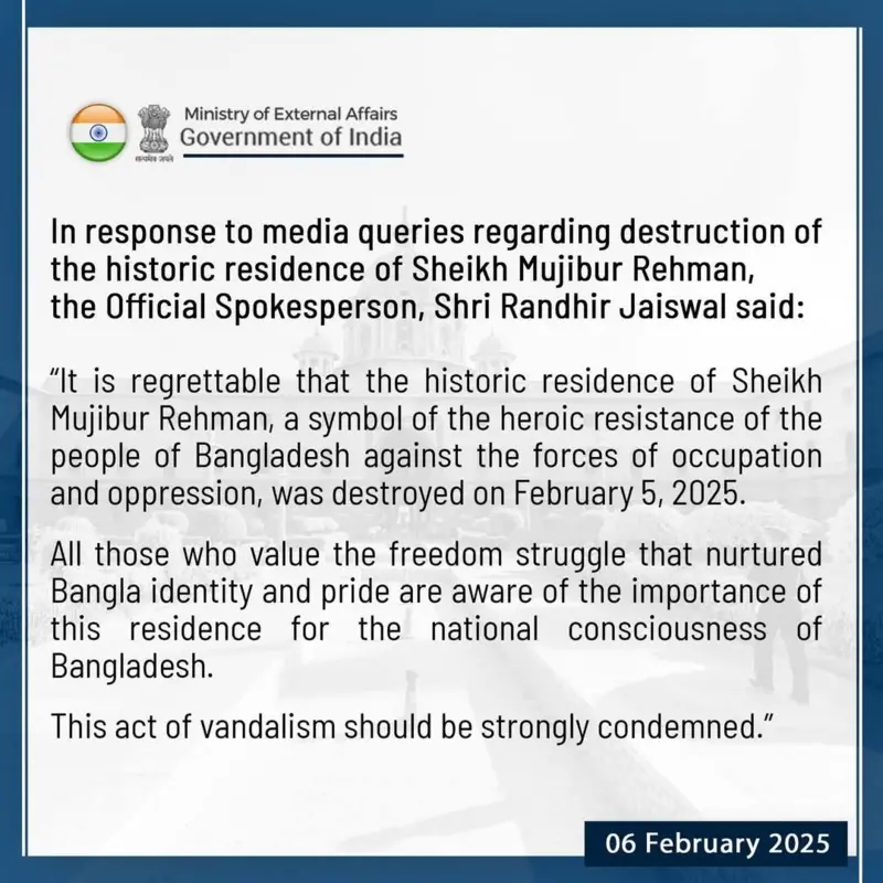পররাষ্ট্র মন্ত্রণালয়ের মুখপাত্র রণধীর জয়সওয়ালকে উদ্ধৃত করে সেখানে বলা হয়েছে, “শেখ মুজিবুর রহমান, যিনি দখলদার বাহিনী ও নির্যাতনের বিরুদ্ধে বাংলাদেশের মানুষের বীরোচিত প্রতিরোধের মূর্ত প্রতীক ছিলেন, তার ঐতিহাসিক বাসভবনটি যেভাবে পাঁচই ফেব্রুয়ারি ধ্বংস করা হয়েছে তা অত্যন্ত দুর্ভাগ্যজনক।”