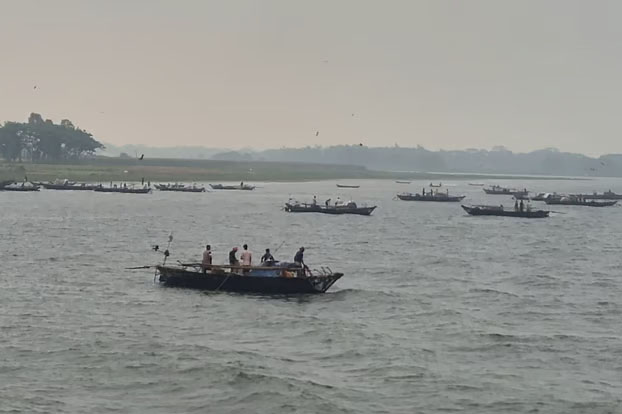 আজ সোমবার সকাল ছয়টা থেকে আটটা পর্যন্ত সরেজমিন দেখা যায়, মেঘনা নদীর চাঁদপুর লঞ্চঘাট থেকে শুরু করে মতলব উত্তরের এখলাসপুর পর্যন্ত এলাকায় দ্রুতগামী ইঞ্জিনচালিত নৌকা নিয়ে জেলেদের মাছ ধরার এই মহোৎসব চলছে। জেলেরা প্রকাশ্যে নদীতে নেমে মাছ ধরছেন এবং নদীর পাড়েই এসব মাছ বিক্রি করছেন।