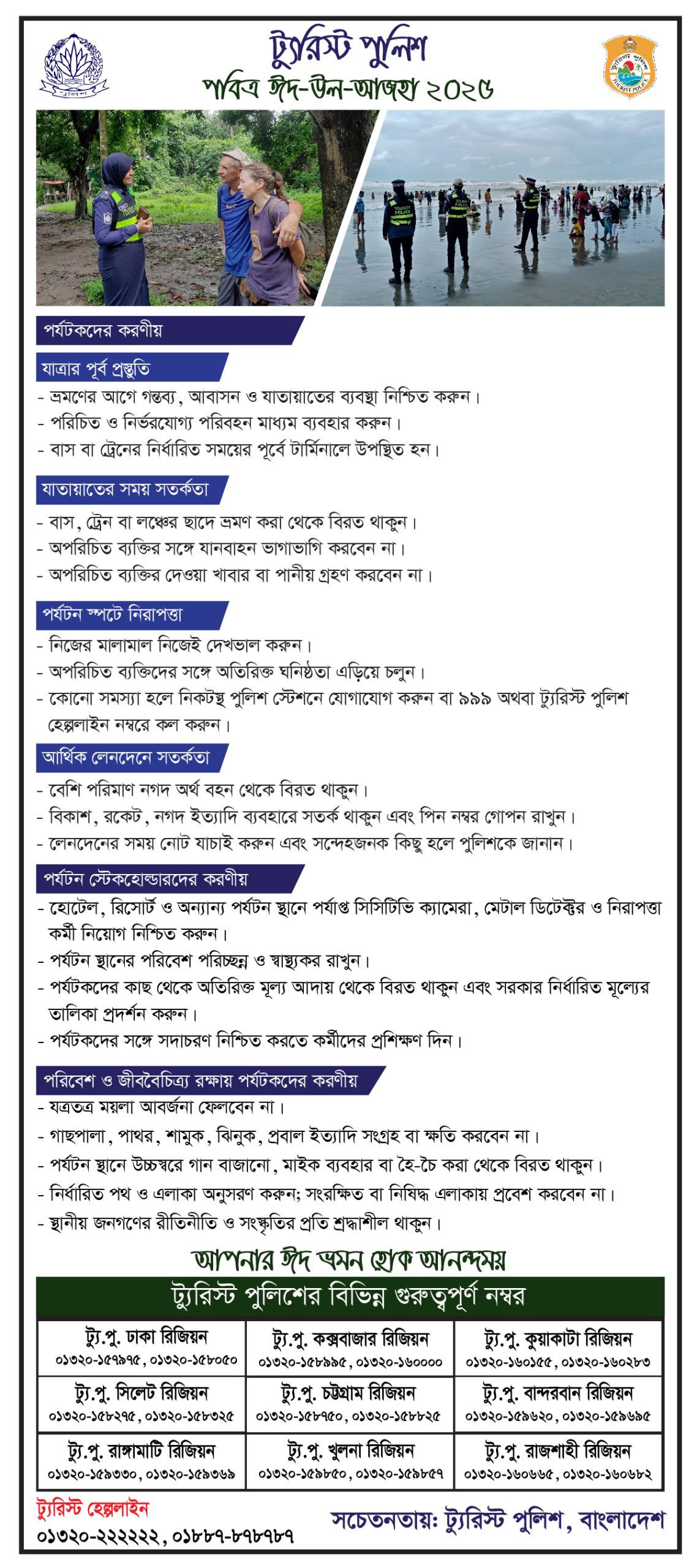 জাতীয় প্রধান সংবাদ বিজ্ঞাপন সর্বশেষ পবিত্র ঈদুল আযহা উপলক্ষে পর্যটকদের করণীয় শীর্ষক ট্যুরিস্ট পুলিশের গুরুত্বপূর্ণ নির্দেশনা Faruk Hossain June 4, 2025 2:50 PM Continue Reading Previous: পঞ্চগড়ে ভুট্টাক্ষেতে বিদ্যুতের ছেঁড়া তারে স্পৃষ্ট হয়ে তিনজনের মৃত্যুNext: ঈদের ছুটিতেও খোলা থাকবে সব ফিলিং স্টেশন Leave a Reply Cancel replyYour email address will not be published. Required fields are marked *Comment * Name * Email * Website Save my name, email, and website in this browser for the next time I comment. Related Stories সোহরাওয়ার্দী হাসপাতালে চিকিৎসকের বিরদ্ধে মারধরের অভিযোগ, কর্মবিরতিতে নার্সরা প্রধান সংবাদ সোহরাওয়ার্দী হাসপাতালে চিকিৎসকের বিরদ্ধে মারধরের অভিযোগ, কর্মবিরতিতে নার্সরা October 16, 2025 1:07 PM গাজায় ফের অভিযান চালাতে পারে ইসরায়েল: ট্রাম্প 1 min read আন্তর্জাতিক গাজায় ফের অভিযান চালাতে পারে ইসরায়েল: ট্রাম্প October 16, 2025 10:22 AM এইচএসসি পরীক্ষার ফল প্রকাশ আজ, যেভাবে জানা যাবে 1 min read প্রধান সংবাদ এইচএসসি পরীক্ষার ফল প্রকাশ আজ, যেভাবে জানা যাবে October 16, 2025 10:10 AM