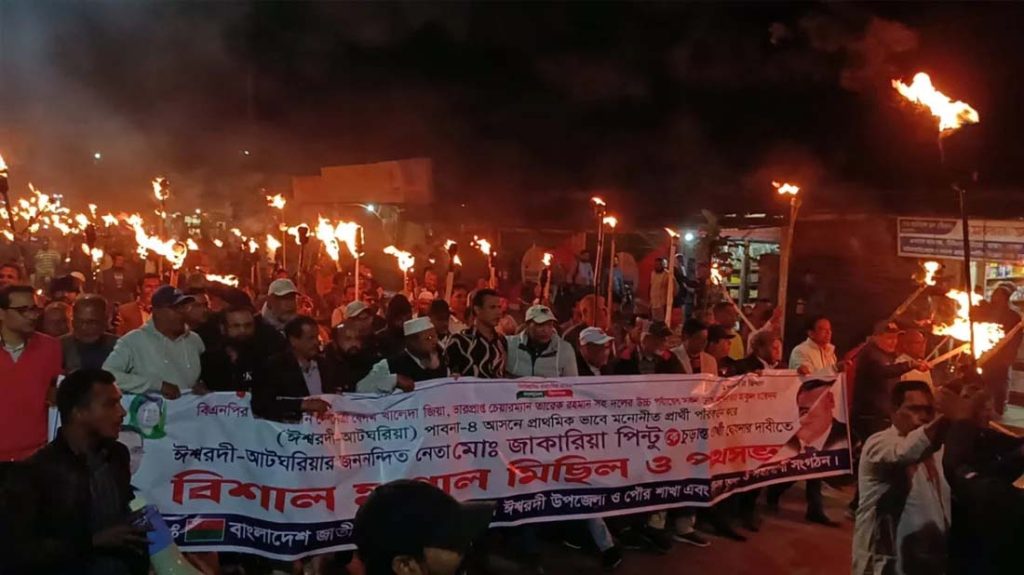 বিএনপির প্রাথমিক মনোনয়ন পরিবর্তনের দাবিতে ঈশ্বরদীতে বিশাল মশাল মিছিল ও বিক্ষোভ সমাবেশ অনুষ্ঠিত হয়েছে।