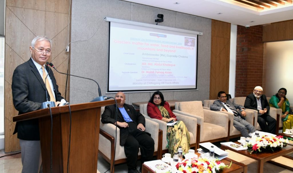 উপদেষ্টা সুপ্রদীপ চাকমা আরও বলেন, আন্তর্জাতিক পর্বত দিবসের এবছরের প্রতিপাদ্য Glaciers matter for water, food and livelihoods in mountains and beyond (”হিমবাহ গলনে সবচেয়ে বেশি ক্ষতি কার?/পাহাড়, জল, খাদ্য, জীবন ও জীবিকার”) যা খুবই তাৎপর্যপূর্ণ। পার্বত্য চট্টগ্রামের জন্য অত্যন্ত প্রাসঙ্গিক আন্তর্জাতিক পর্বত দিবসের উপর এমন সুন্দর একটি সেমিনার রাজধানীতে আয়োজন করায় এর আয়োজকদের তিনি ধন্যবাদ জ্ঞাপন করেন। উপদেষ্টা রাষ্ট্রদূত (অব.) সুপ্রদীপ চাকমা আরও বলেন, বাংলাদেশের ৬১ জেলার সাথে তাল মিলিয়ে পার্বত্য অঞ্চলের এই পরিবেশে সবকিছুই খাপ খাওয়ানো সম্ভব না। পাহাড়ের মানুষের জীবন-জীবিকার ভিত্তি হলো এর নিজস্ব পরিবেশ। যুগ যুগ ধরে জলবায়ু পরিবর্তনের সাথে পার্বত্য অঞ্চলের মানুষের খাপ খাওয়ানোর প্রবণতা আগে ছিল সহনশীল। ন্যাচারেলি যা কিছু ঘটে তা মানুষ টলারেট করতে পারে। যখনই ন্যাচারেলির পরিবর্তে সেখানে অন্য কোনো কৃত্রিমতাকে দাঁড় করানো হয়, তখনই ঘটে বিপত্তি-এমন মন্তব্য করেন উপদেষ্টা সুপ্রদীপ চাকমা। তিনি এ প্রসঙ্গে ২০১৭ সালে ঘটে যাওয়া ল্যন্ডস্লাইডকে স্মরণ করিয়ে দিয়ে বলেন, ইকো ট্যুরিজমকে নষ্ট করার অধিকার কারো নেই। তিনি কাপ্তাই লেক-এর সৌন্দর্য্য নষ্ট হওয়ার জন্য অসচেতনতা ও অসাবধানতাকে দায়ী করেন। তিনি এ সংক্রান্ত সংশ্লিষ্ট সকলের আচরণে পরিবর্তন আনার ইঙ্গিত দেন।