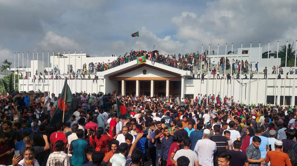 তেজগাঁয়ের সাবেক প্রধানমন্ত্রীর কার্যালয়ের উপর জনতার উল্লাস। ছবি: সংগৃহীত