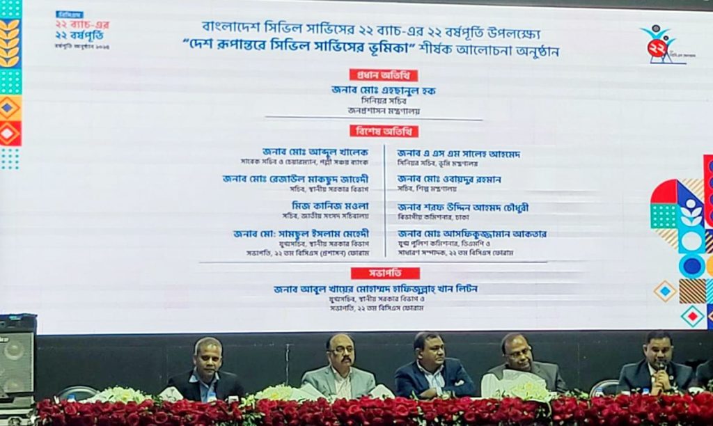 বাংলাদেশ সিভিল সার্ভিসের ২২ ব্যাচের ২২ বছর পূর্তি উদযাপন উপলক্ষে ’দেশ রূপান্তরে সিভিল সার্ভিসের ভূমিকা’ শীর্ষক আলোচনা সভা অনুষ্ঠিত হয়।