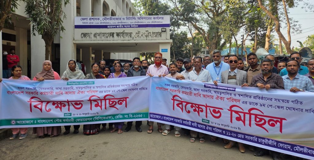 বাংলাদেশ পৌর কর্মচারী ফেডারেশন (বিপিকেএফ) রেজিঃ নং বি-২২৩৫ ও বাংলাদেশ সরকারি কর্মচারী দাবী আদায় ঐক্য পরিষদ, মৌলভীবাজার এর আয়োজনে বিক্ষোভ মিছিলে মৌলভীবাজারের বিভিন্ন শ্রেণীর কর্মচারীবৃন্দ অংশগ্রহন করেন এবং মিছিল পরবর্তী বক্তব্য প্রদান করেন.. বনজয় দেব, দীন ইসলাম, দবির উদ্দিন আহমদ ও সুমন দোসাদ নাজমুল ইসলাম, সল্যানা সরকার, একে যে নুরুজ্জামান প্রমূখ।