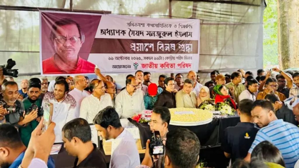 ঢাকা বিশ্ববিদ্যালয়ের ইংরেজি বিভাগের ইমেরিটাস অধ্যাপক ও কথাসাহিত্যিক সৈয়দ মনজুরুল ইসলামের মরদেহ সর্বসাধারণের শ্রদ্ধা নিবেদনের জন্য কেন্দ্রীয় শহীদ মিনারে নেওয়া হয়েছে।