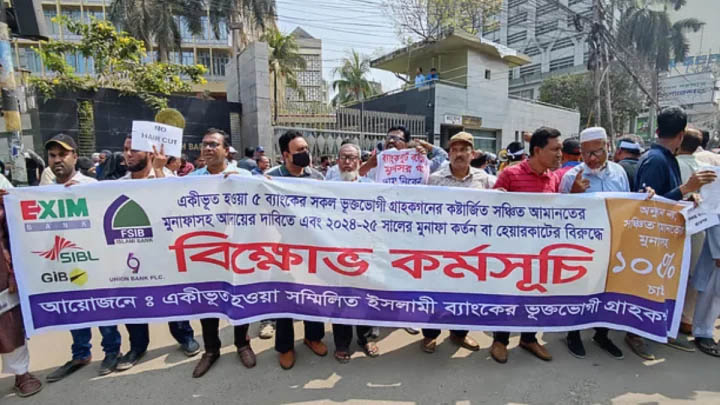 বেলা ১১টায় শুরু হওয়া এই মানববন্ধন ও অবস্থান কর্মসূচিতে বক্তারা আরও অভিযোগ করেন যে, শরিয়াহভিত্তিক এই পাঁচটি ব্যাংকের মুনাফা কেটে মাত্র ৪ শতাংশ ‘সরকারি অনুকম্পা’ দেওয়ার সিদ্ধান্তটি আমানতকারীদের অধিকারের পরিপন্থী।
