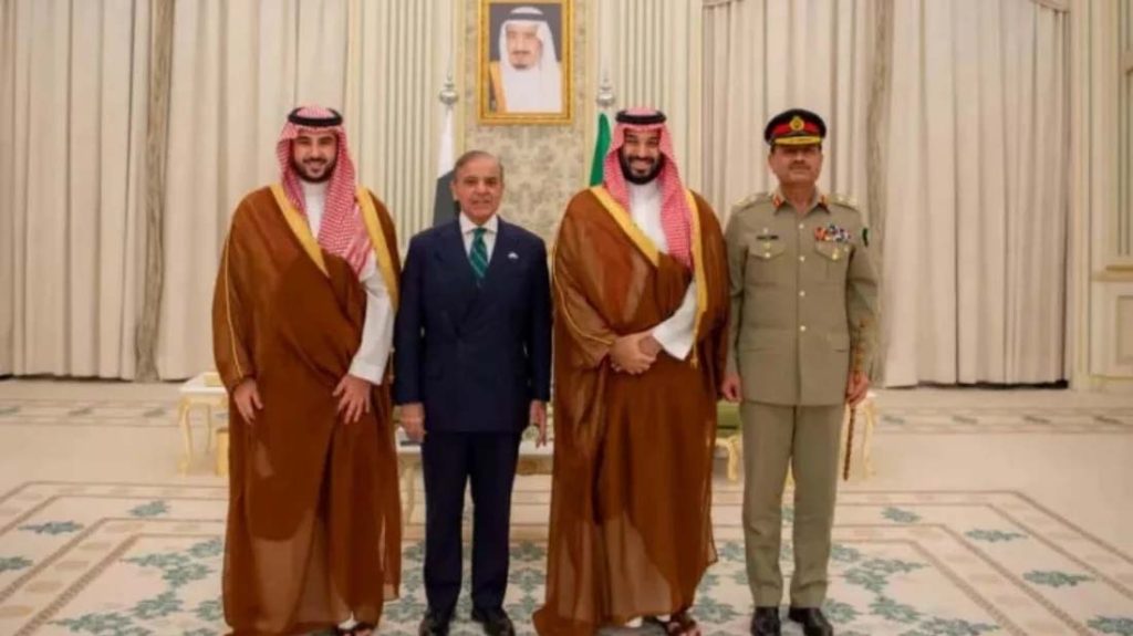 পাকিস্তানের প্রধানমন্ত্রী শাহবাজ শরিফ এবং সৌদি আরবের যুবরাজ মোহাম্মদ বিন সালমান বুধবার (১৮ সেপ্টেম্বর) রিয়াদে ‘কৌশলগত পারস্পরিক প্রতিরক্ষা চুক্তি’ (এসএমডিএ) স্বাক্ষর করেছেন। অনুষ্ঠানে শাহবাজকে সৌদি এফ-১৫ যুদ্ধবিমানের অভিবাদন, লালগালিচা সংবর্ধনা এবং পূর্ণ রাজকীয় প্রটোকলের মাধ্যমে স্বাগত জানানো হয়। স্বাক্ষর অনুষ্ঠানে সৌদি ঊর্ধ্বতন কর্মকর্তারা এবং পাকিস্তানের প্রতিনিধিরা উপস্থিত ছিলেন। স্বাক্ষরের সময় শাহবাজ শরিফ হাস্যোজ্জ্বল ছিলেন।